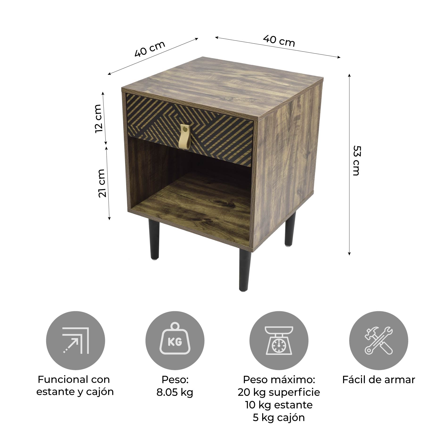 - Peso máximo: 20 kg para tablero superior, 10 kg para estante y 5 kg para cajón