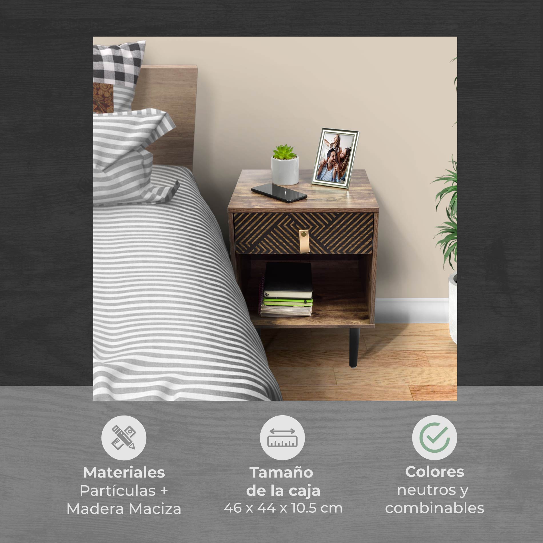 Disfruta de este moderno buró en tonos café y negro con cajón y entrepaño. Suma diseño a tu hogar y dale un toque diferente a tus espacios, gracias a su versatilidad podrás utilizarlo como mesa de noche o mesa auxiliar.