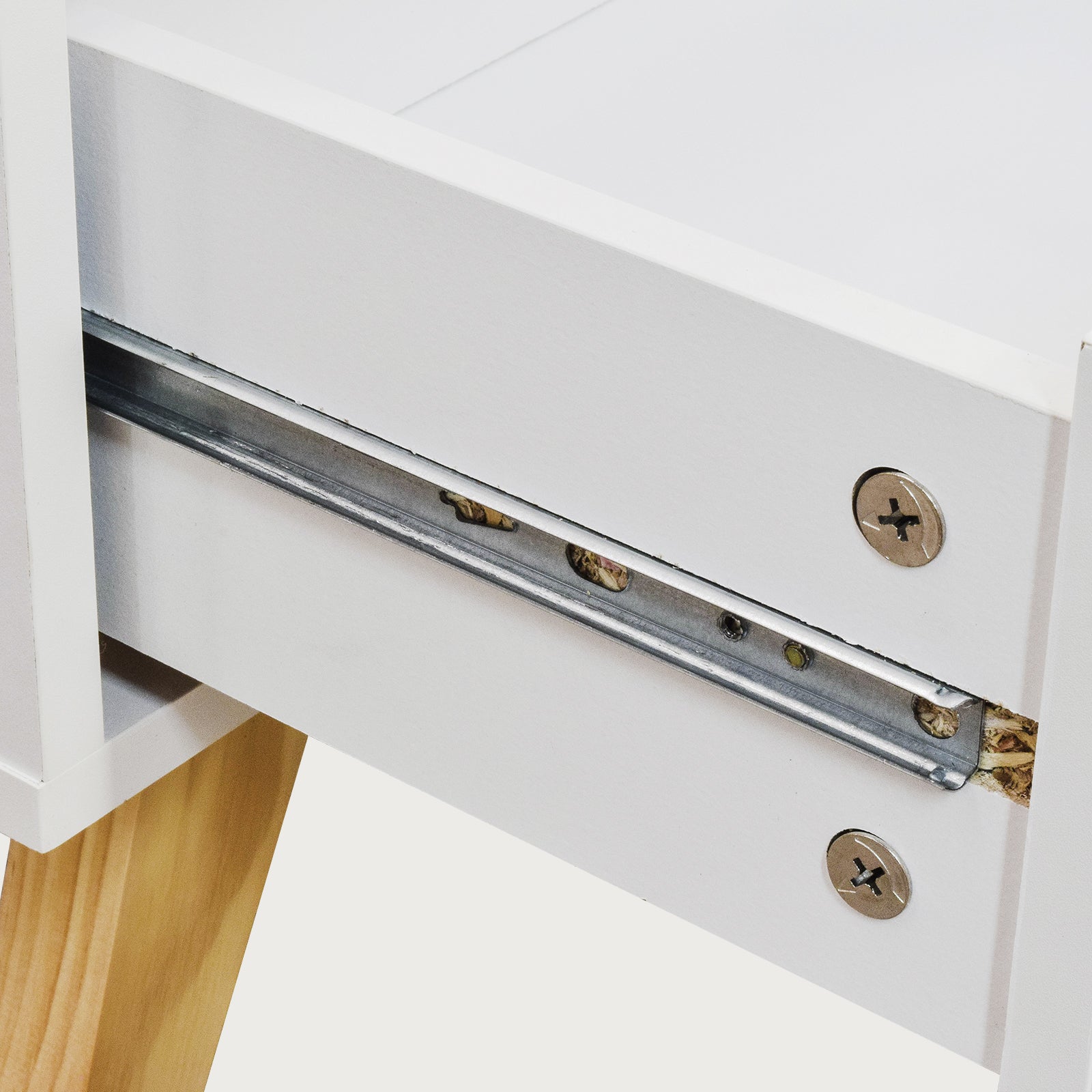 - Cuenta con cajón con rieles metálicos y espacio de almacenamiento, ideales para quienes desean mantener sus espacios visiblemente atractivos y ordenados.