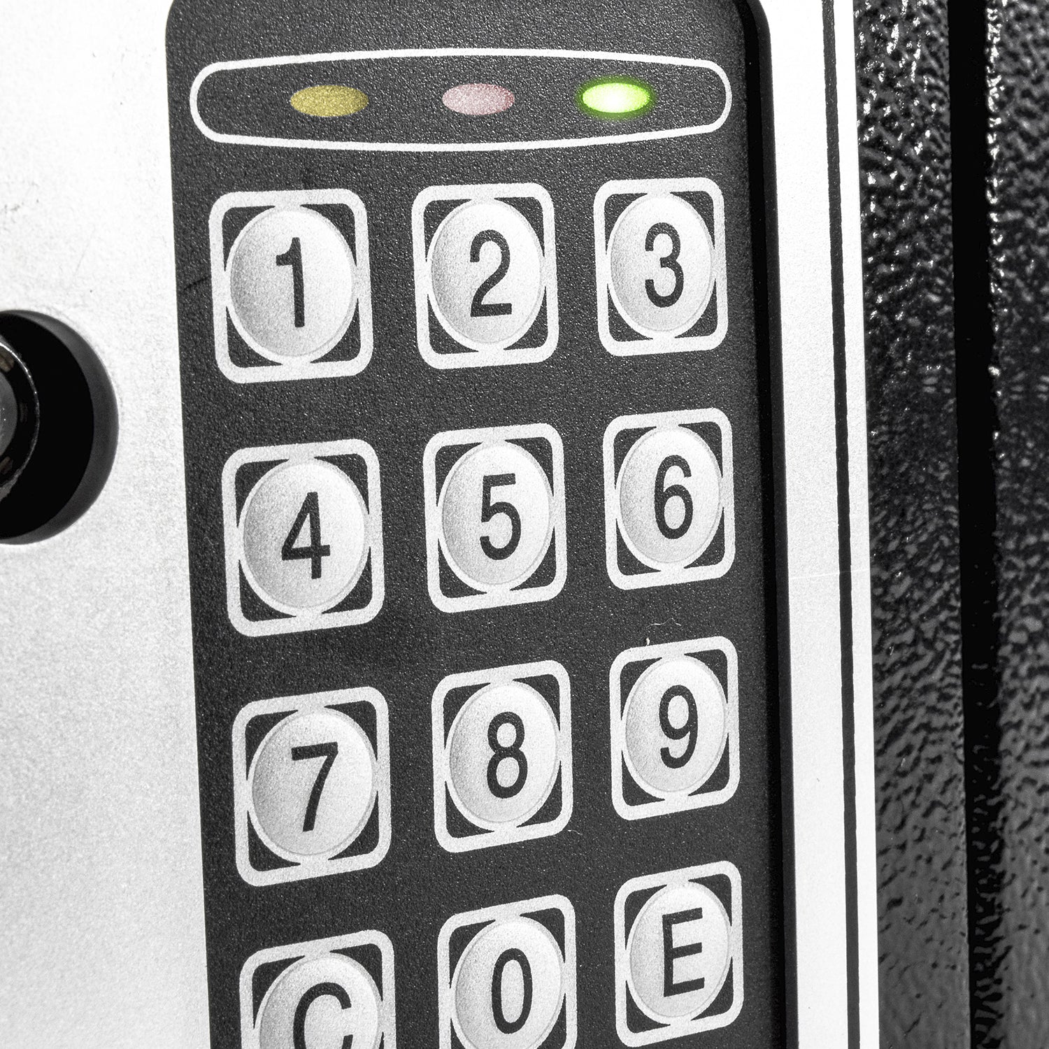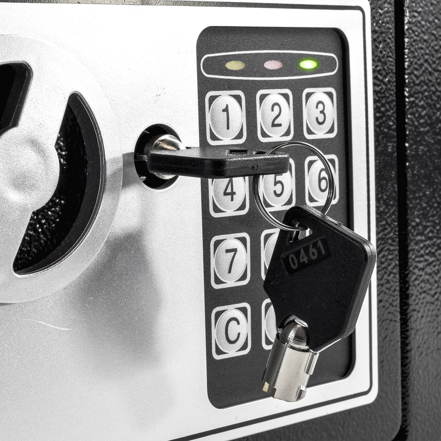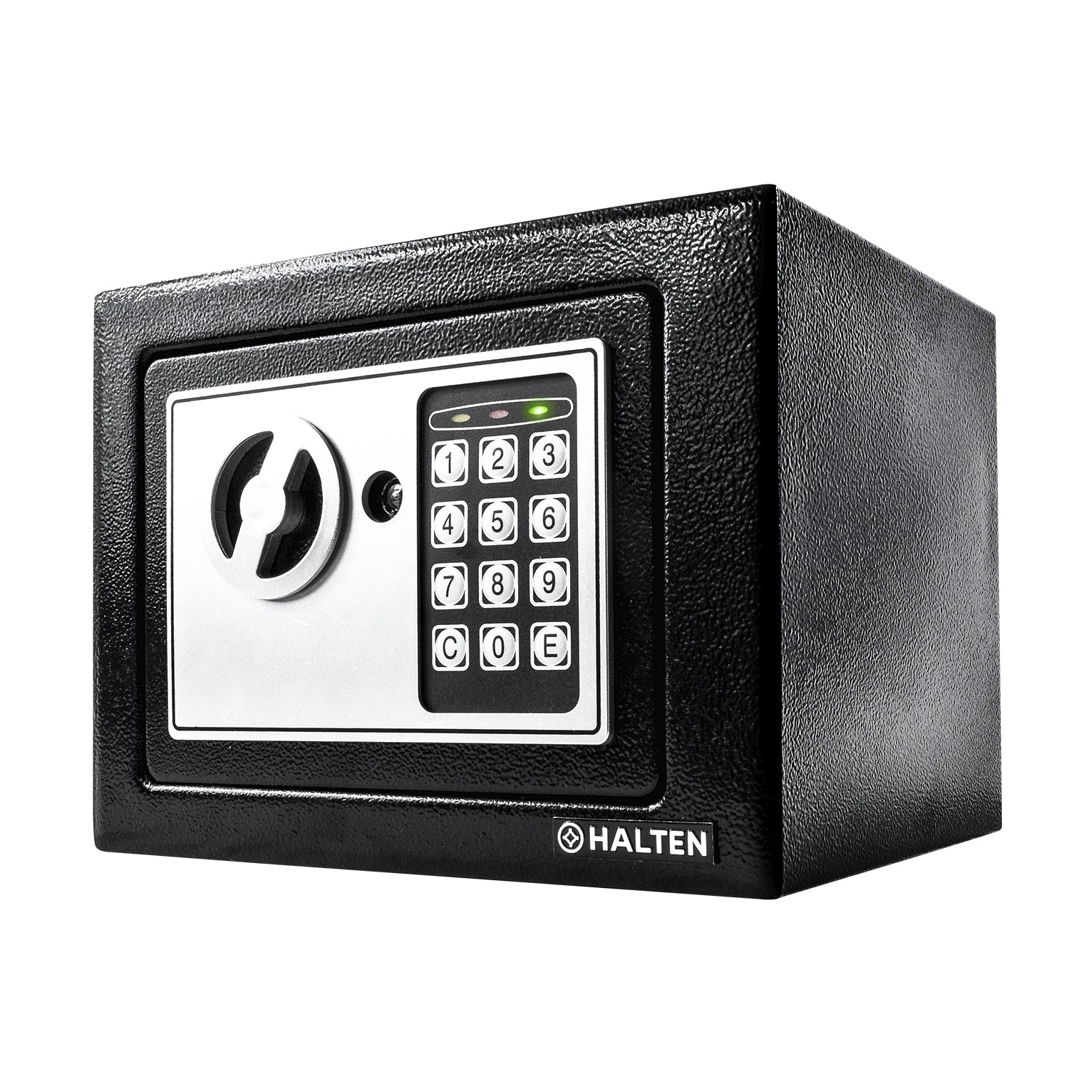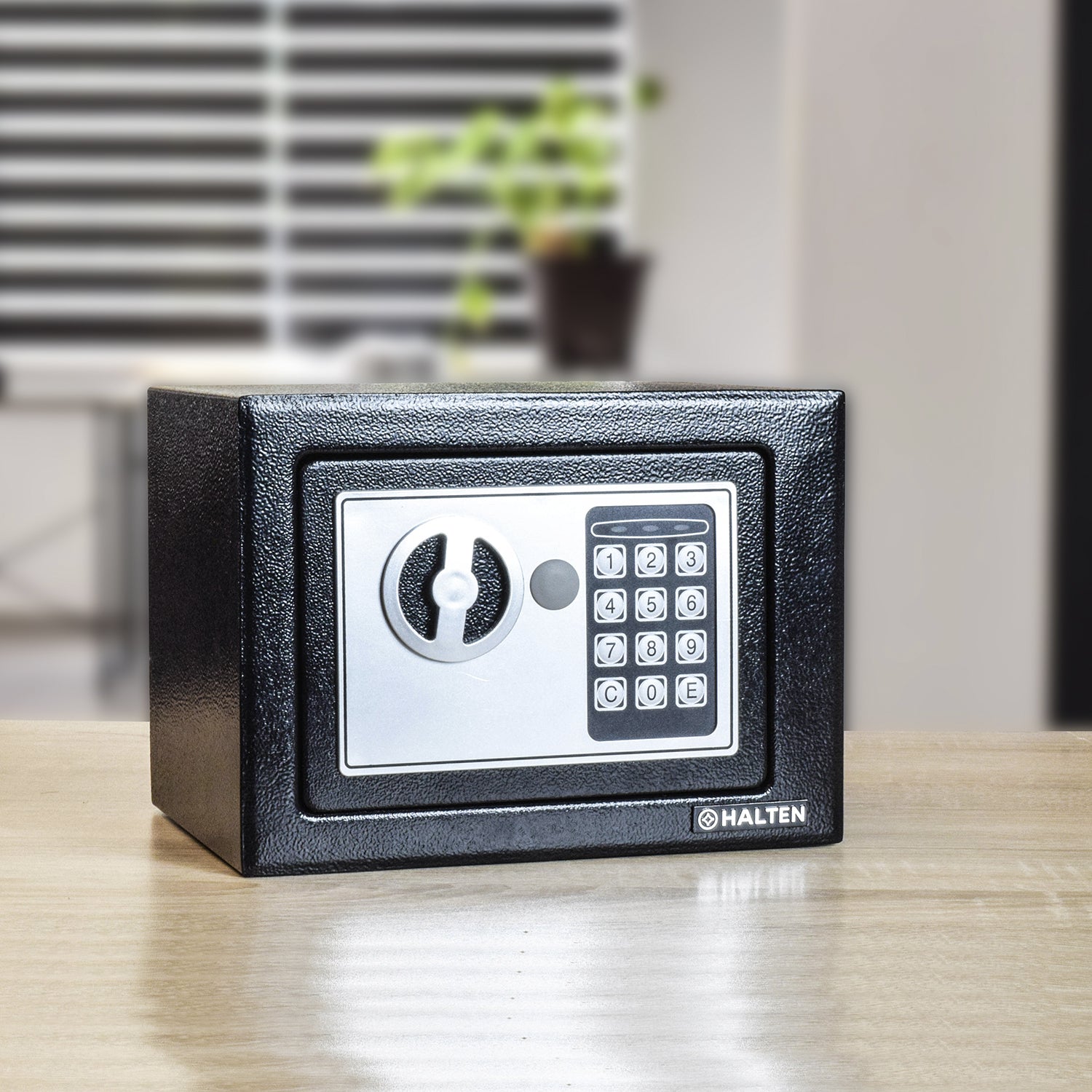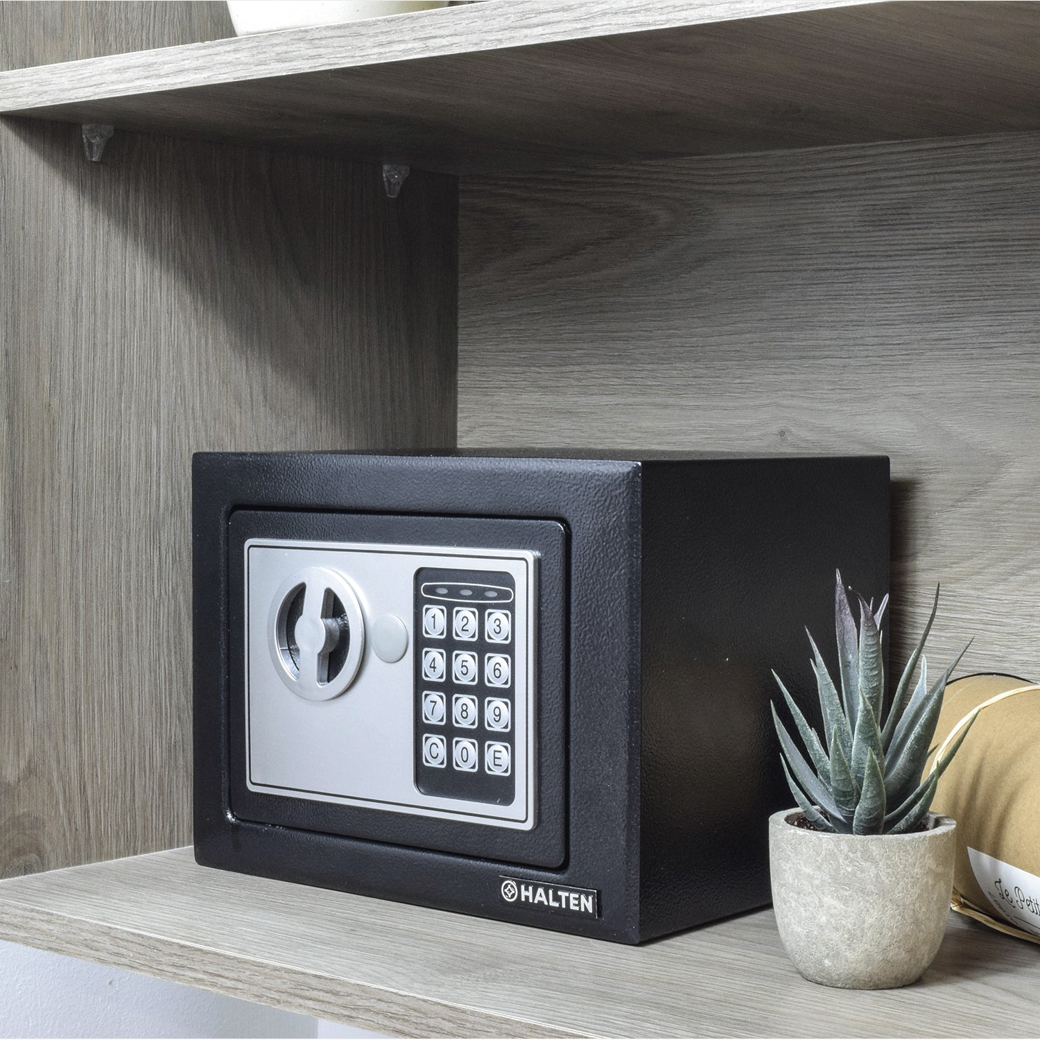 Proteja sus objetos dinero y objetos de valor con esta práctica mini caja de fuerte de Halten rectangular. Es adecuada para colocar en oficinas, negocios u hogares y puede ser instalada en el suelo o en la pared.
