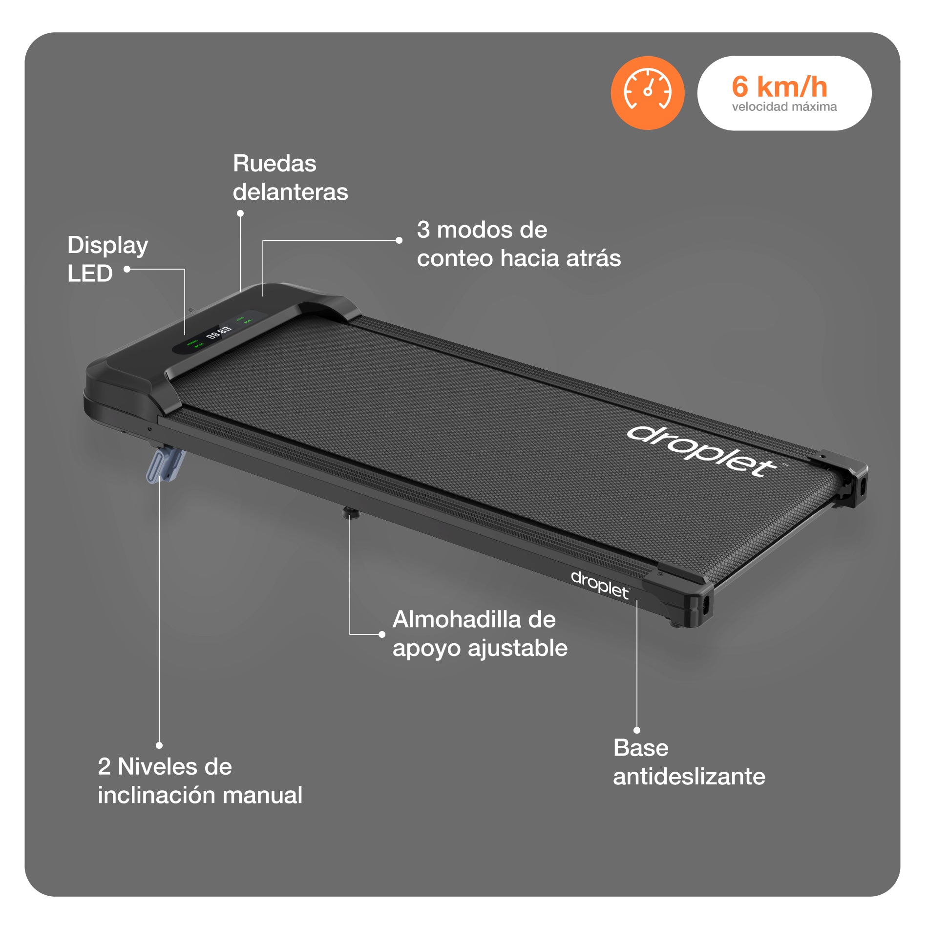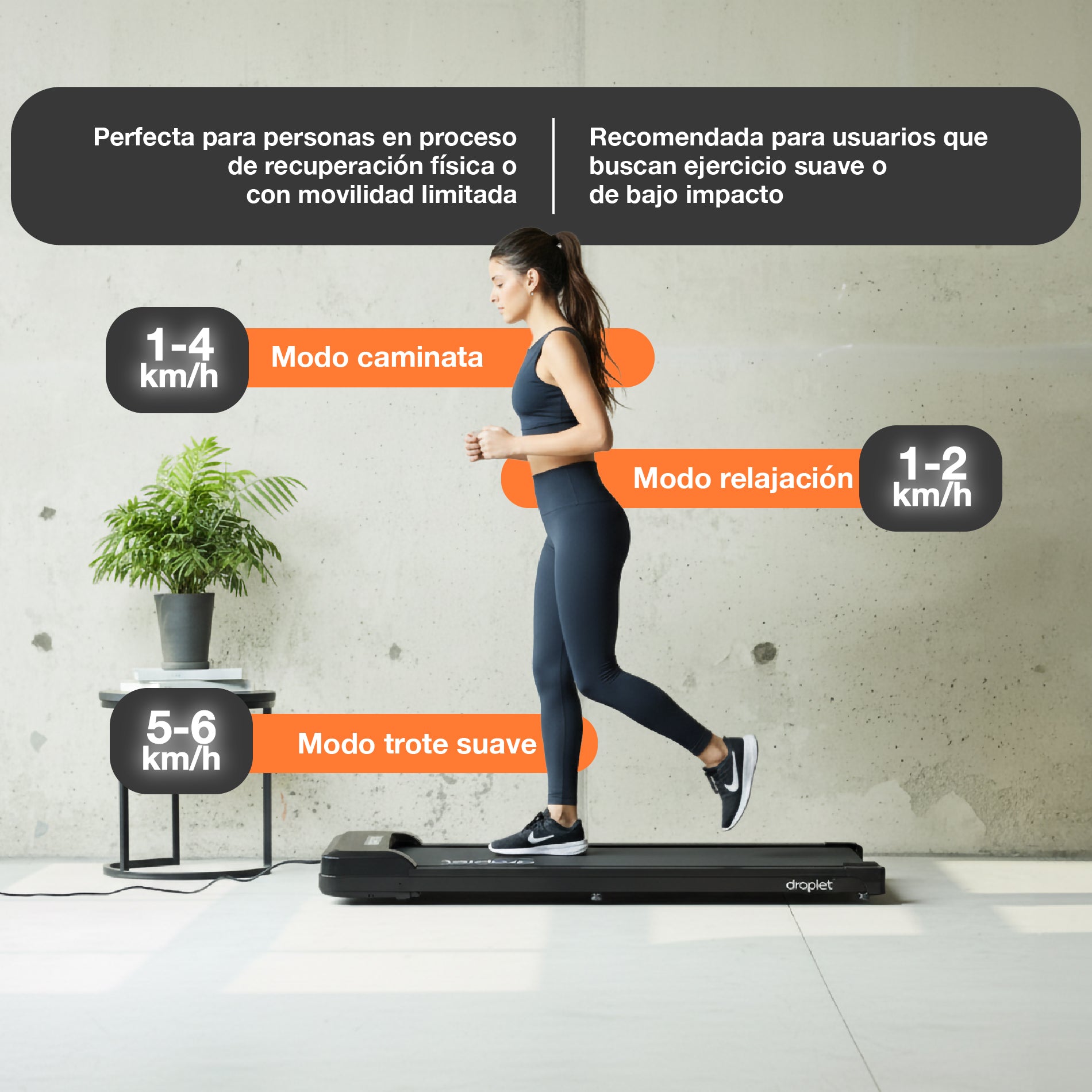 - Mantente en actividad en casa o en la oficina: Ideal para caminar o trotar suave mientras trabajas, ves tus series o escuchas música. Perfecta para escritorios de altura regulable (standing desk).