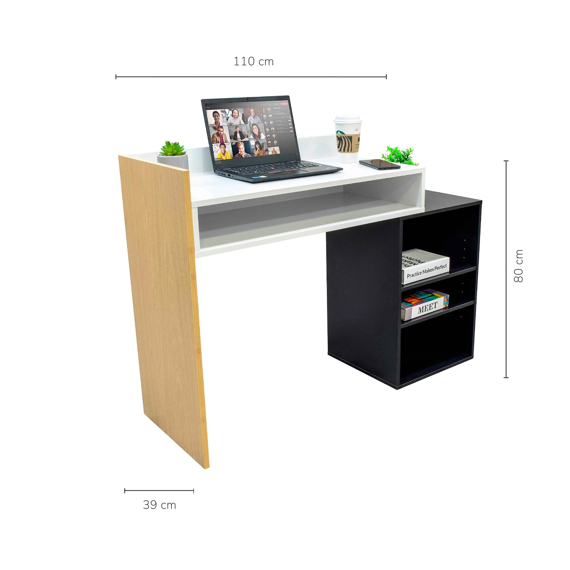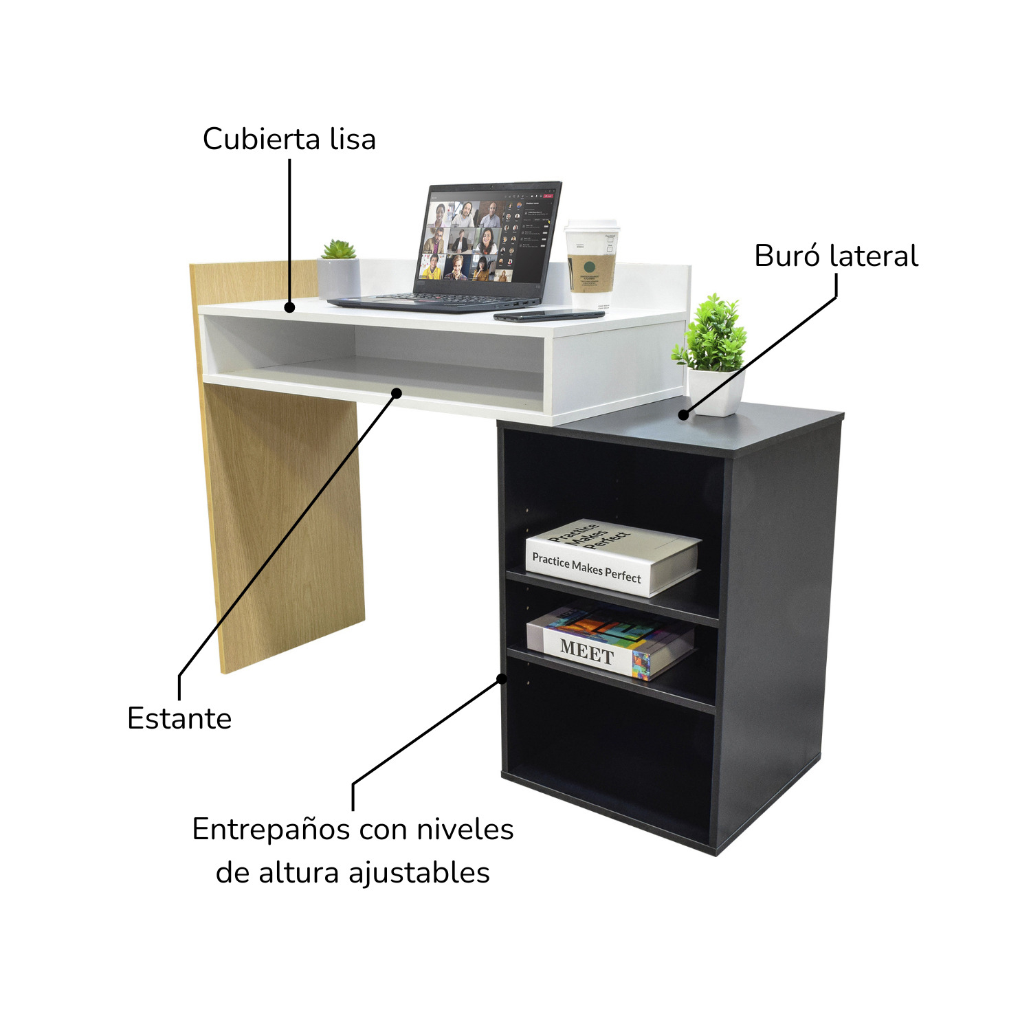 - El escritorio cuenta con entrepaños laterales que se pueden colocar ya sea en izquierda o derecha al momento de ensamblar. Sus niveles son ajustables en altura.