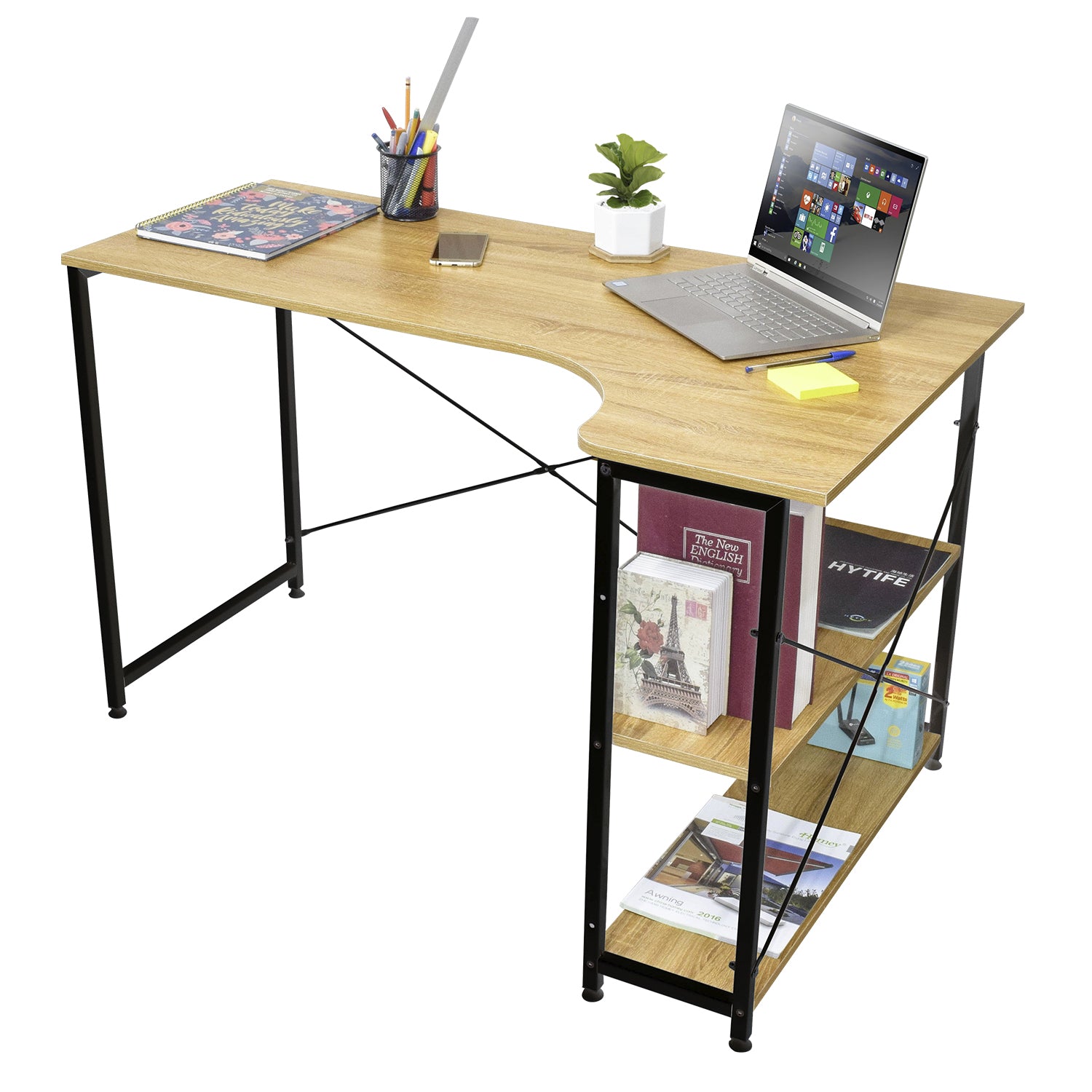 - Cuenta con una amplia superficie de melamina estilo madera que te permite colocar una o dos laptops, teclado, mousepad y muchos elementos más.