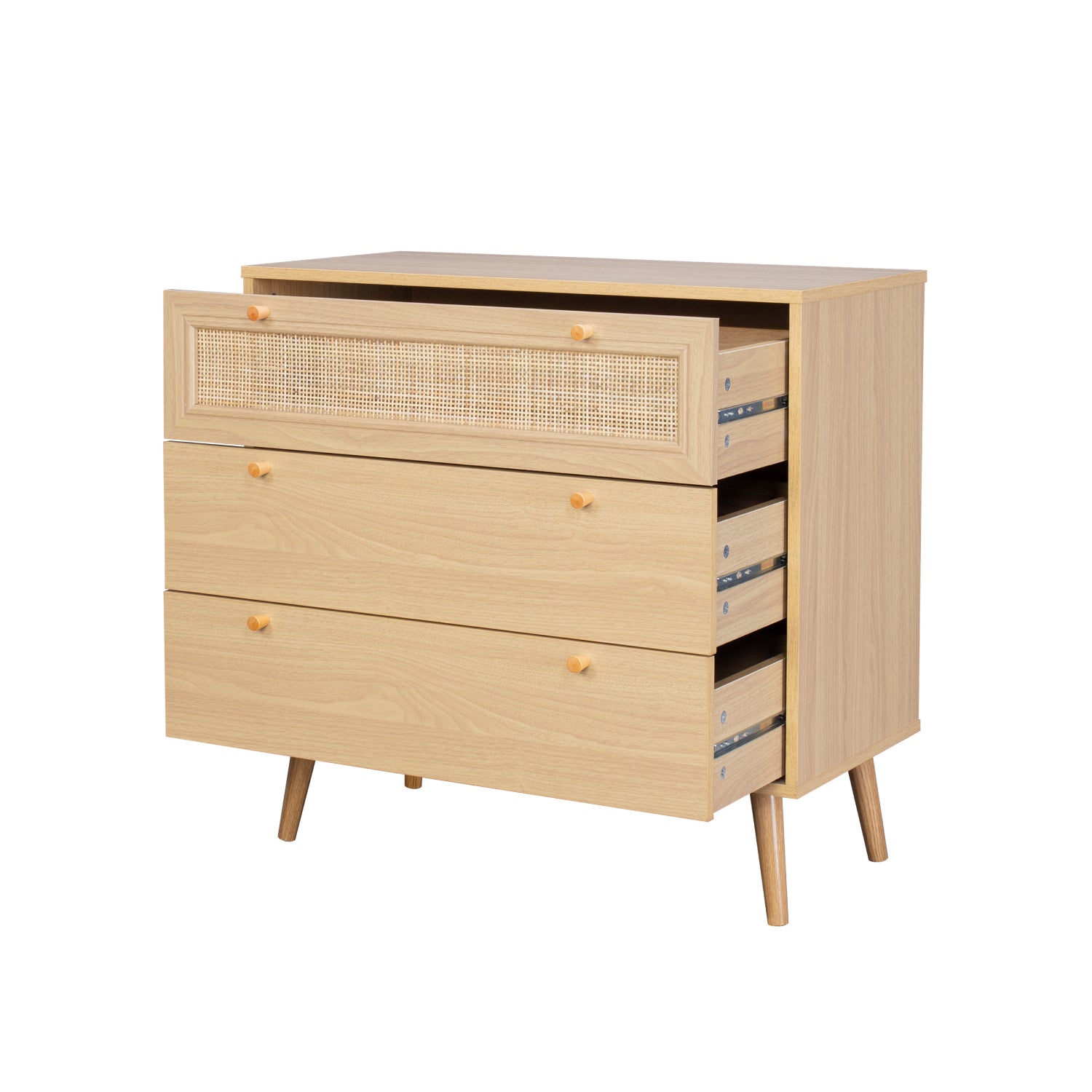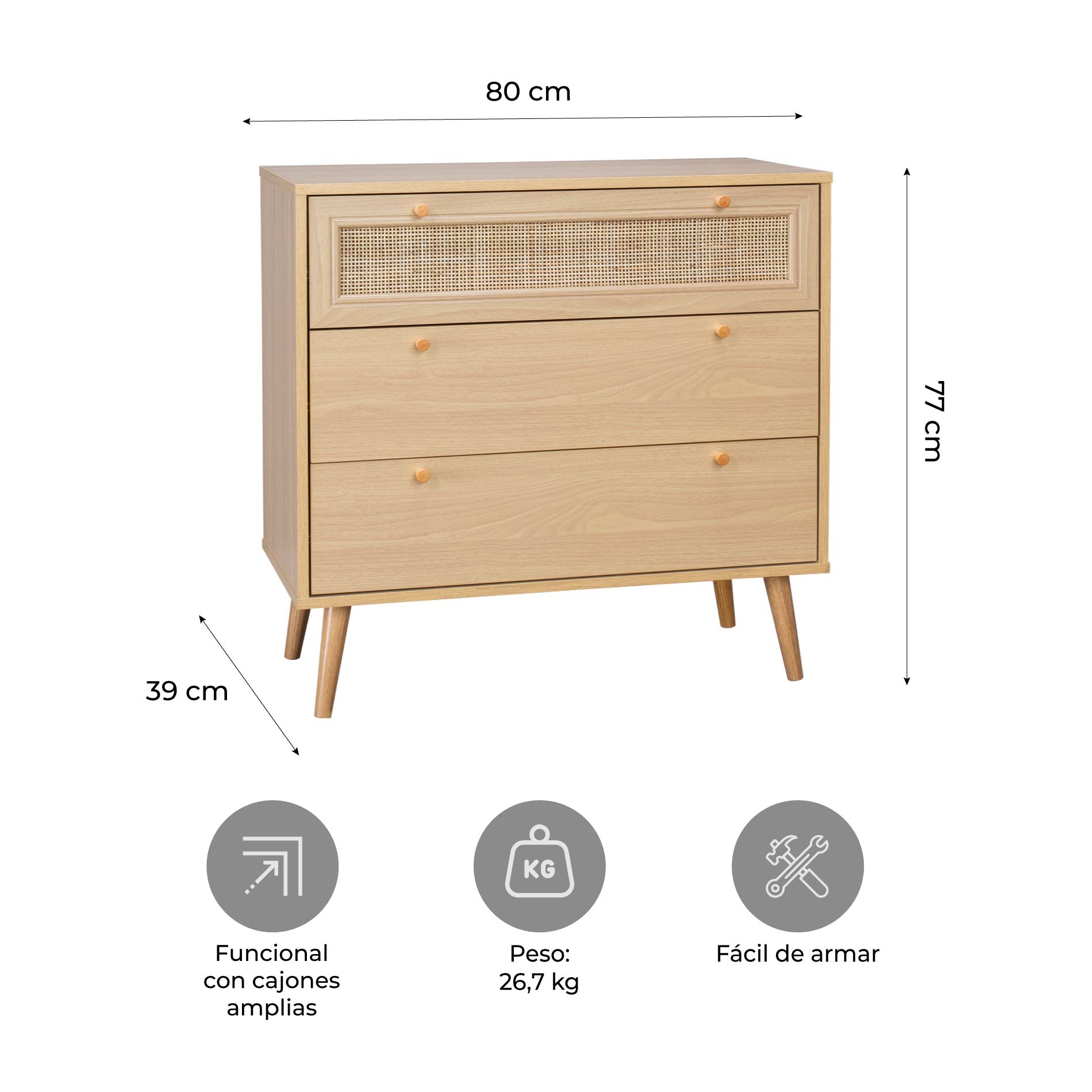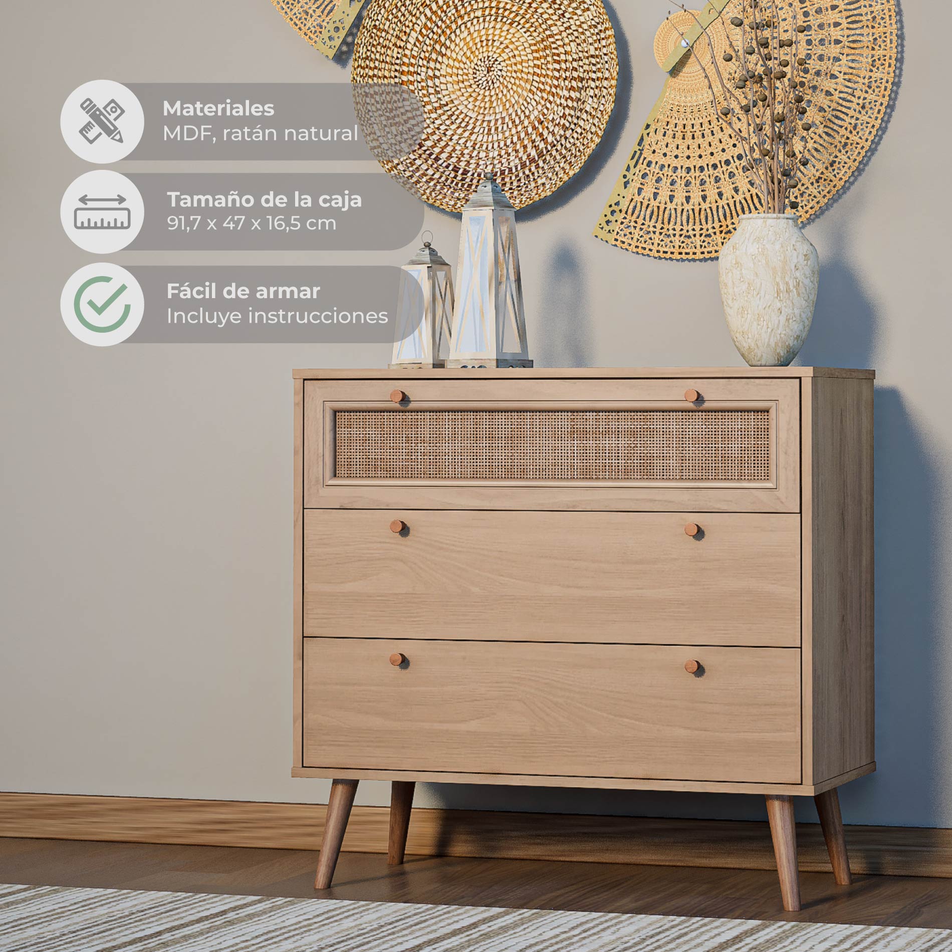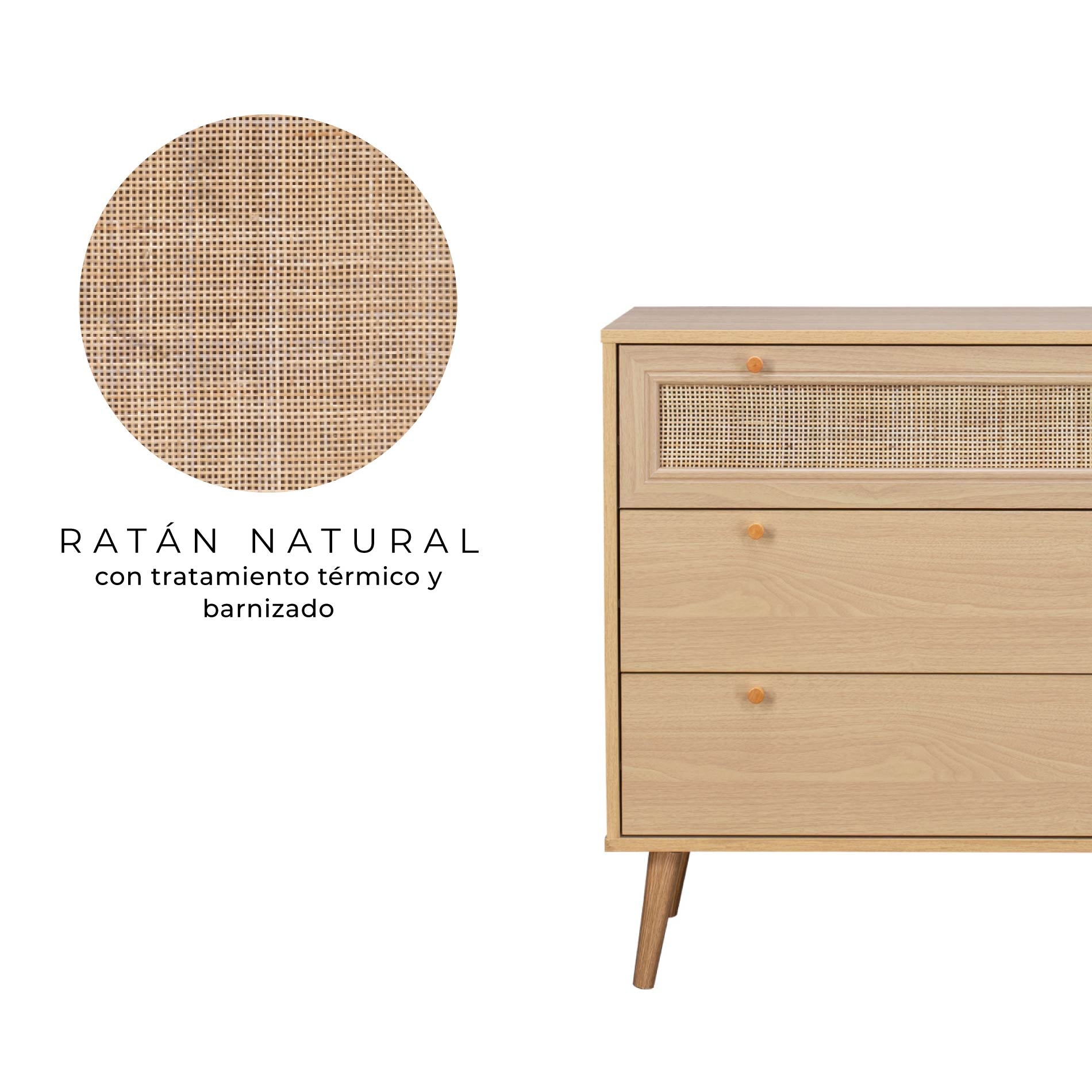 Incorpora esta moderna cómoda con ratán en tu hogar y dale personalidad a tus espacios. Gracias a su material natural y colores claros, es ideal para obtener un estilo decorativo cálido y artesanal. Podrás colocarla en tu sala, recámara o entrada, es un mueble muy versátil.