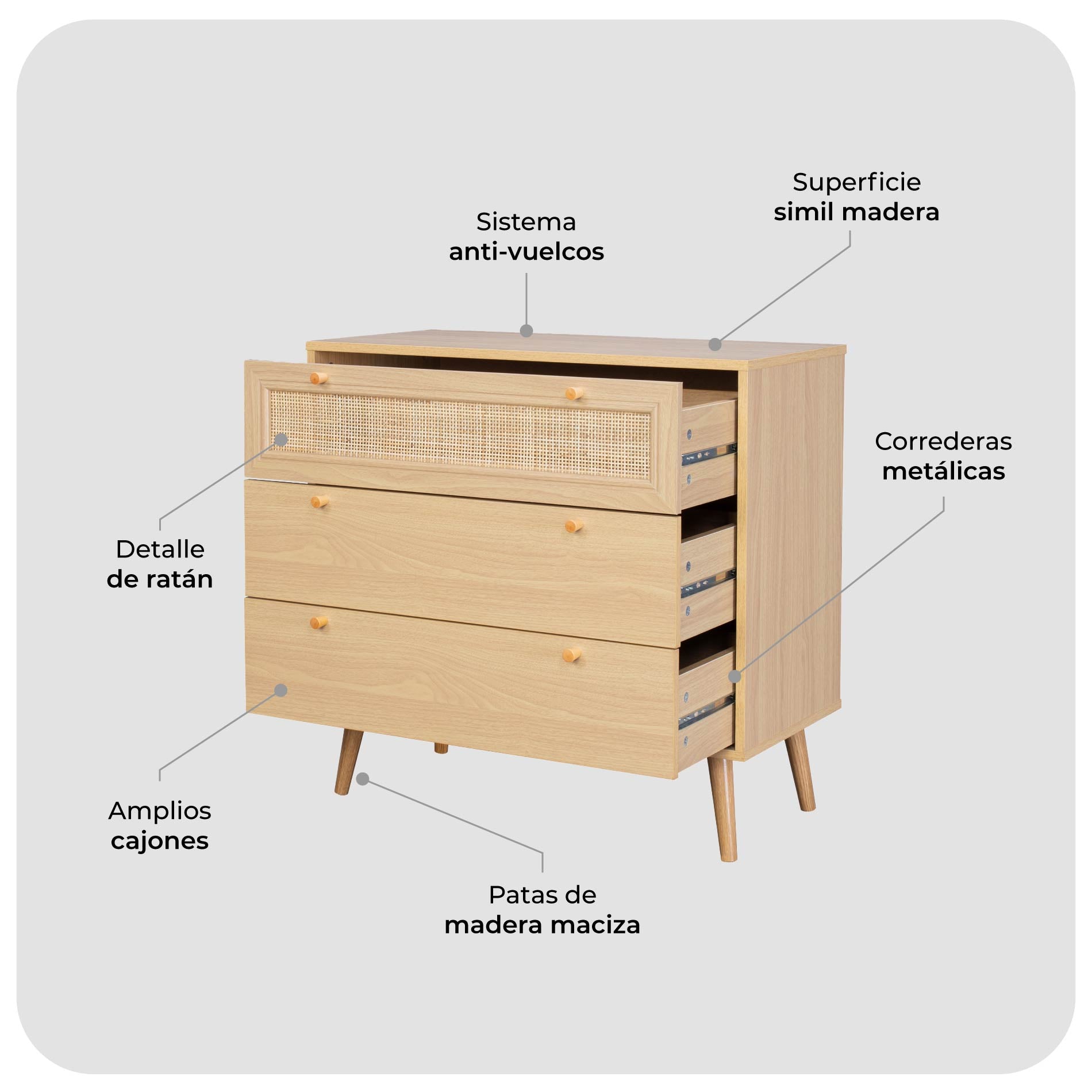 - Cuenta con 3 prácticos y amplios cajones con rieles metálicos, ideales para mantener tus espacios visiblemente ordenados.