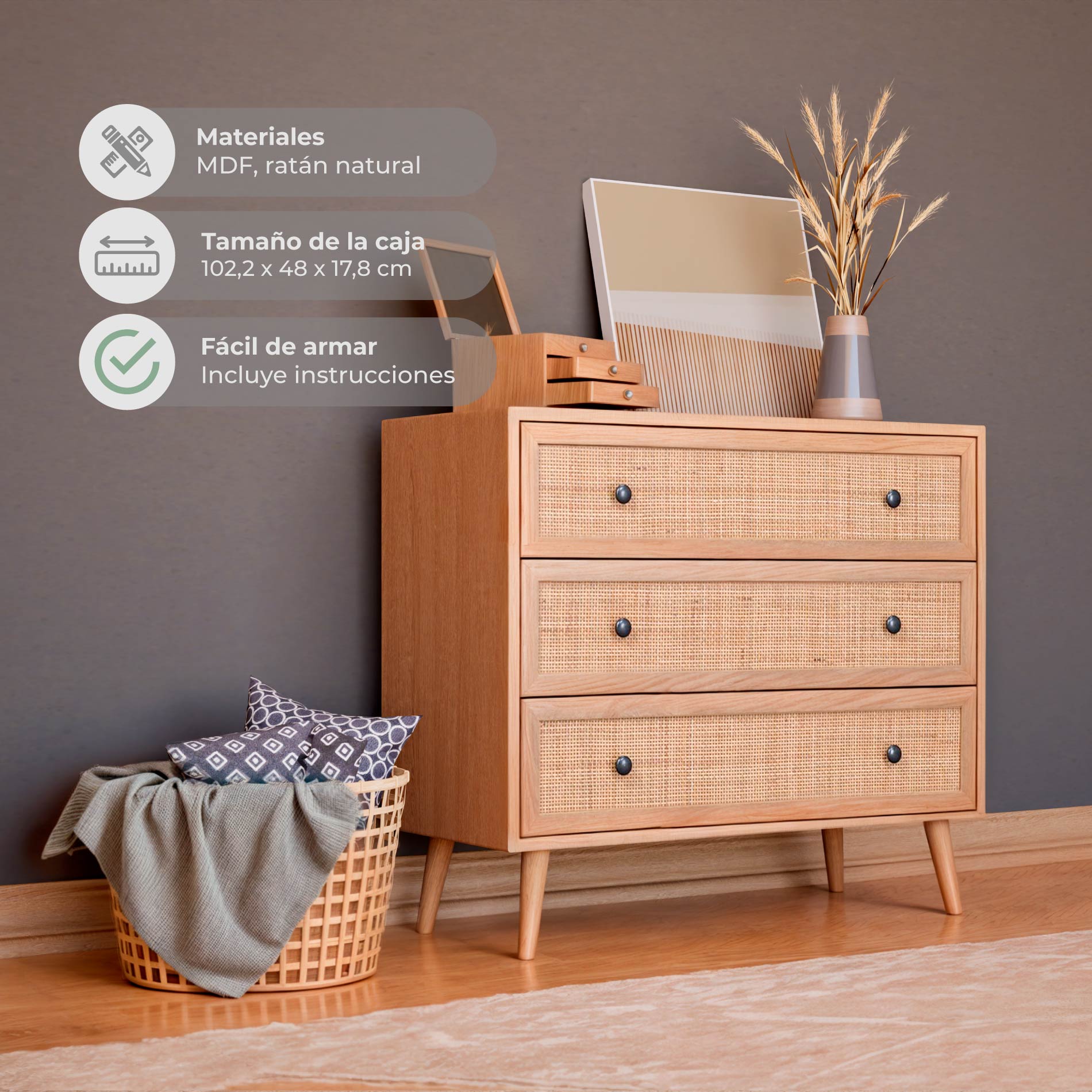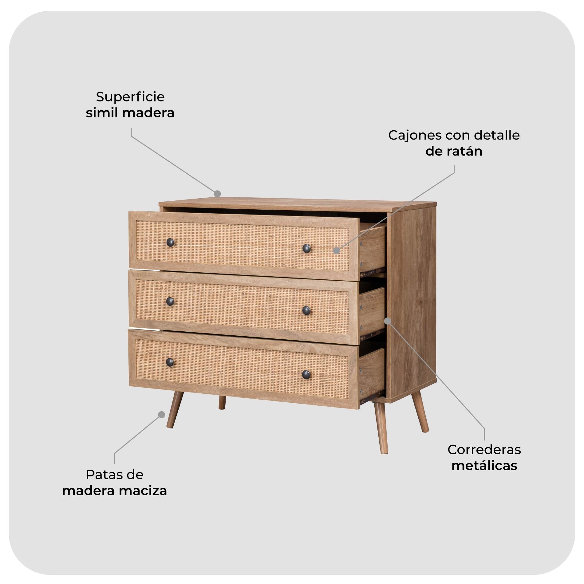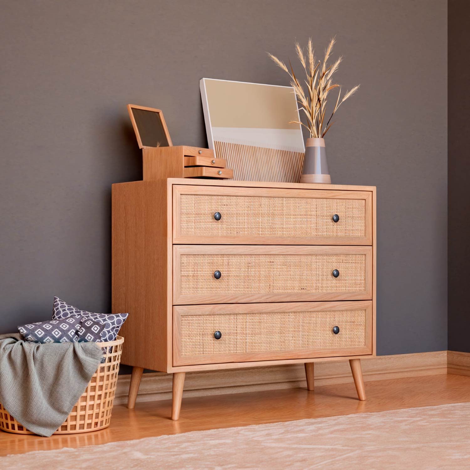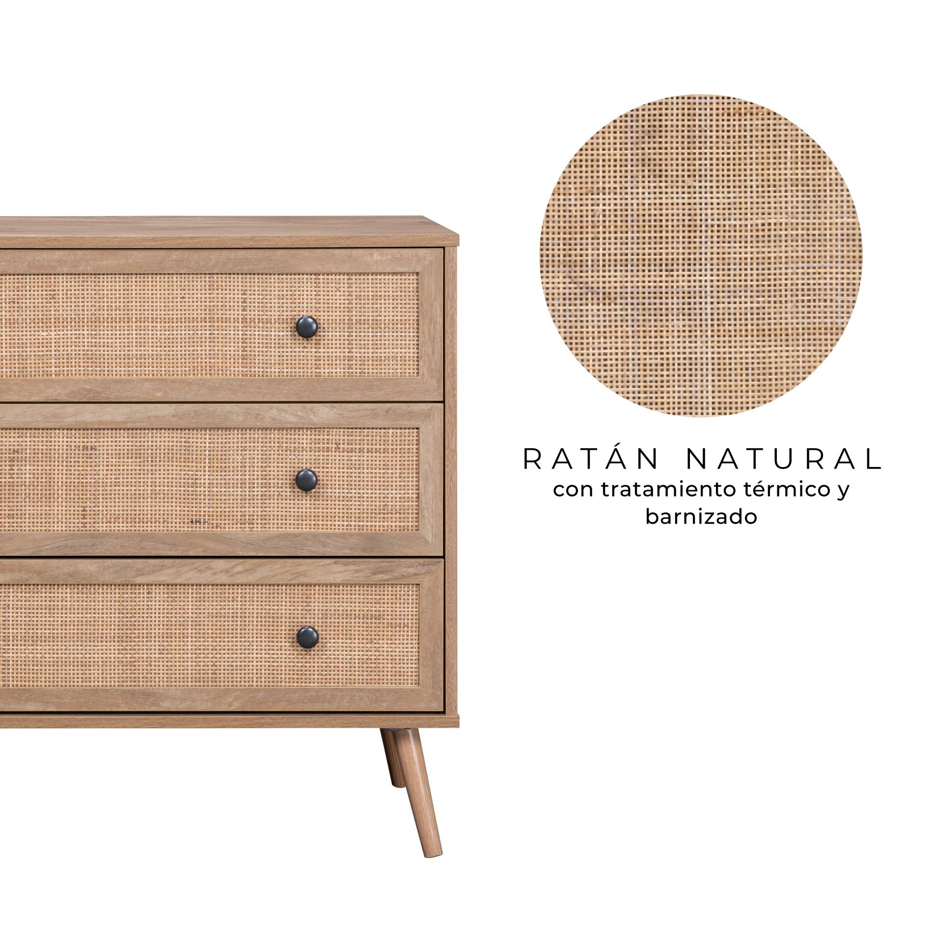 Incorpora esta moderna cómoda con ratán en tu hogar y dale personalidad a tus espacios. Gracias a su material natural y colores claros, es ideal para obtener un estilo decorativo cálido y artesanal. Podrás colocarla en tu sala, recámara o entrada, es un mueble muy versátil.