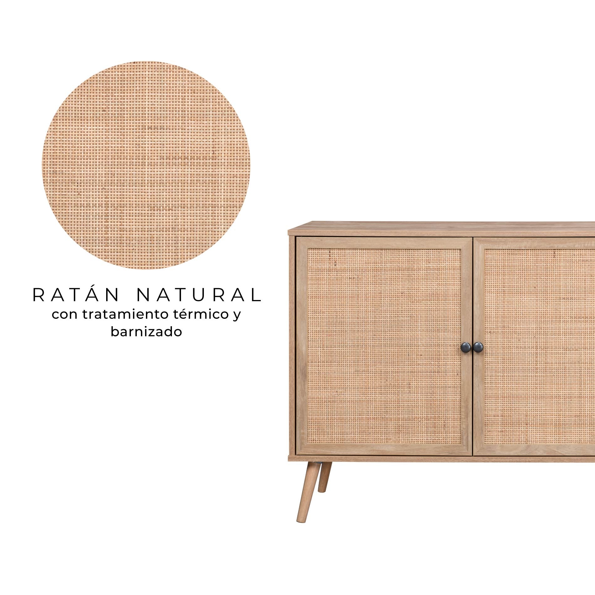- Elaborado en tablero de partículas, MDF y ratán natural con tratamiento térmico y barnizado, procesos que aseguran su resistencia y durabilidad frente a la humedad y el paso del tiempo