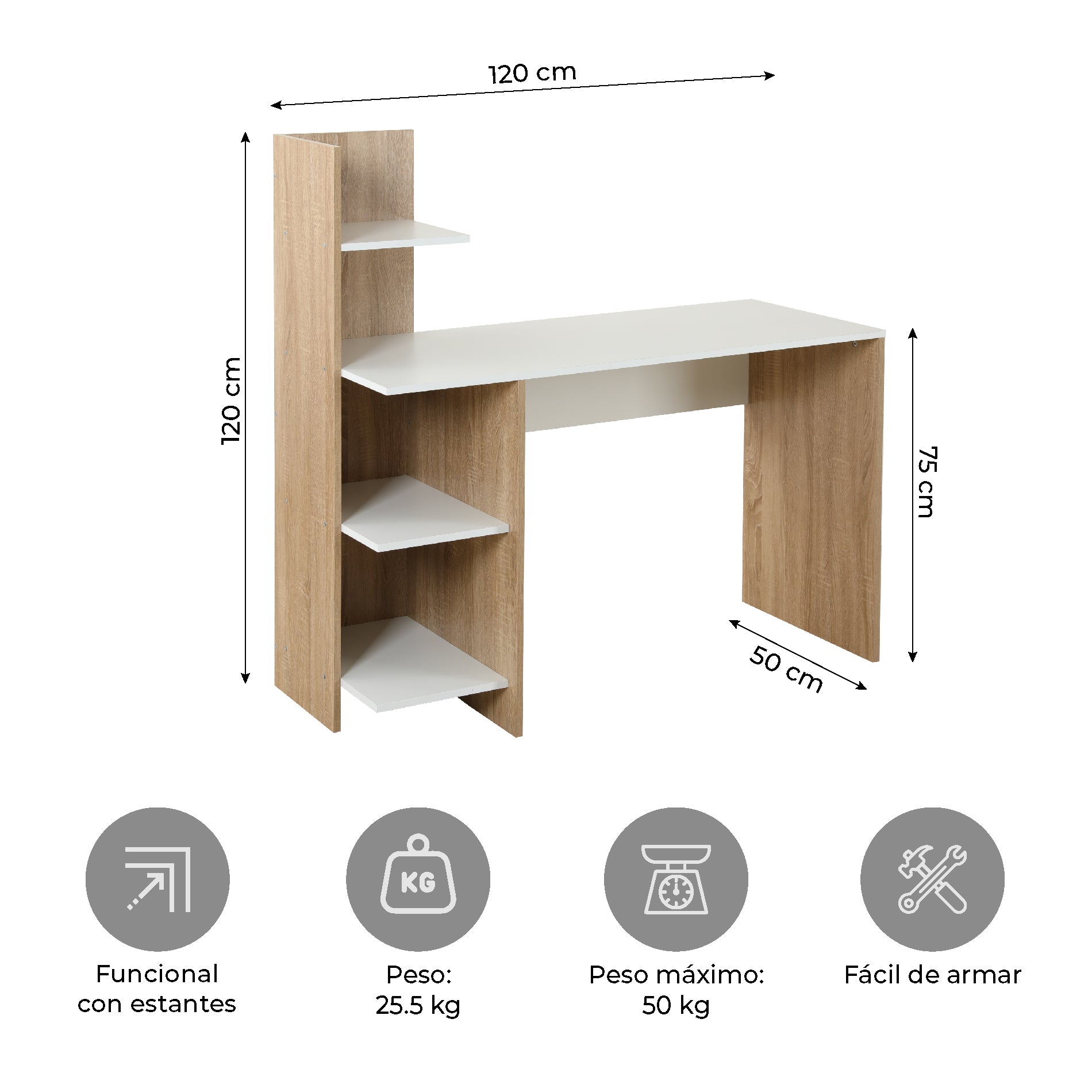 - Cuenta con estantes laterales incorporados para poner tus libros, cuadernos y todo lo que necesites tener al alcance de tu mano.