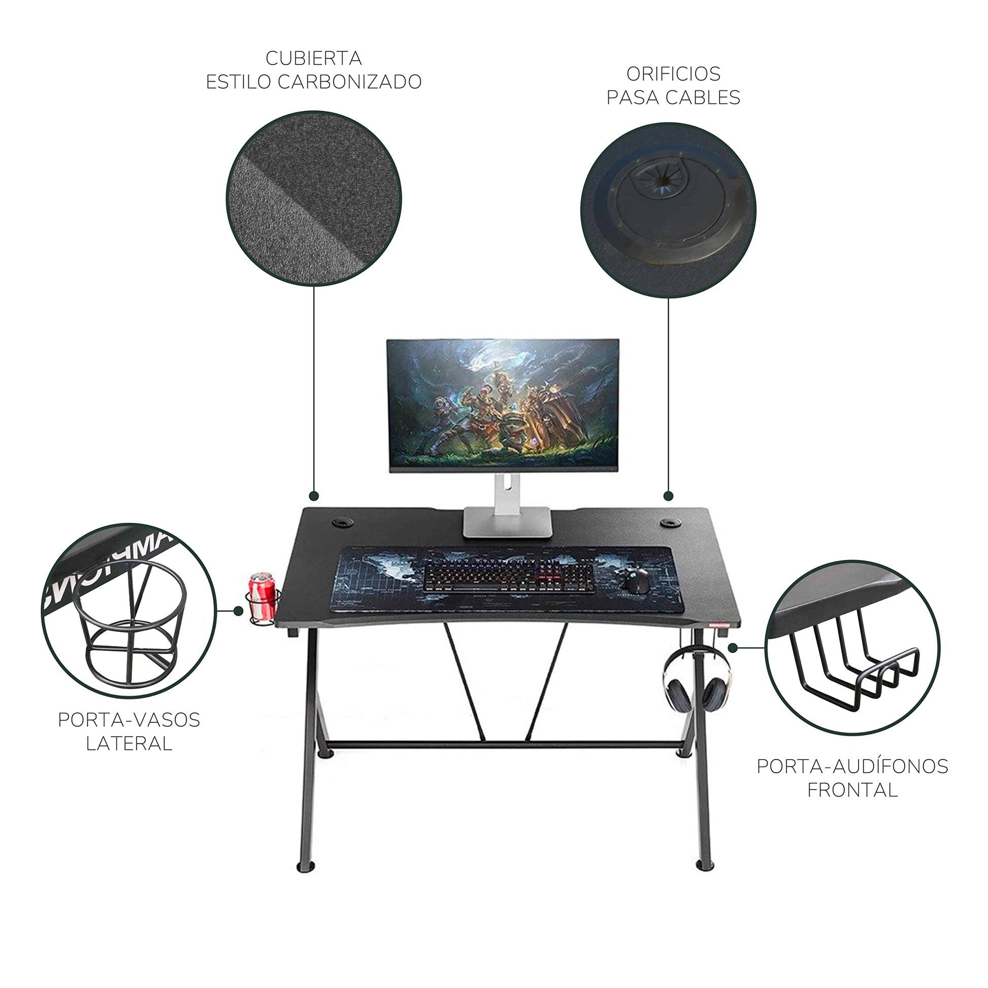 - Cuenta con 2 orificios para cables, porta-vasos lateral y porta-audífonos frontal para que tengas la superficie de tu escritorio totalmente despejada para tus artículos electrónicos