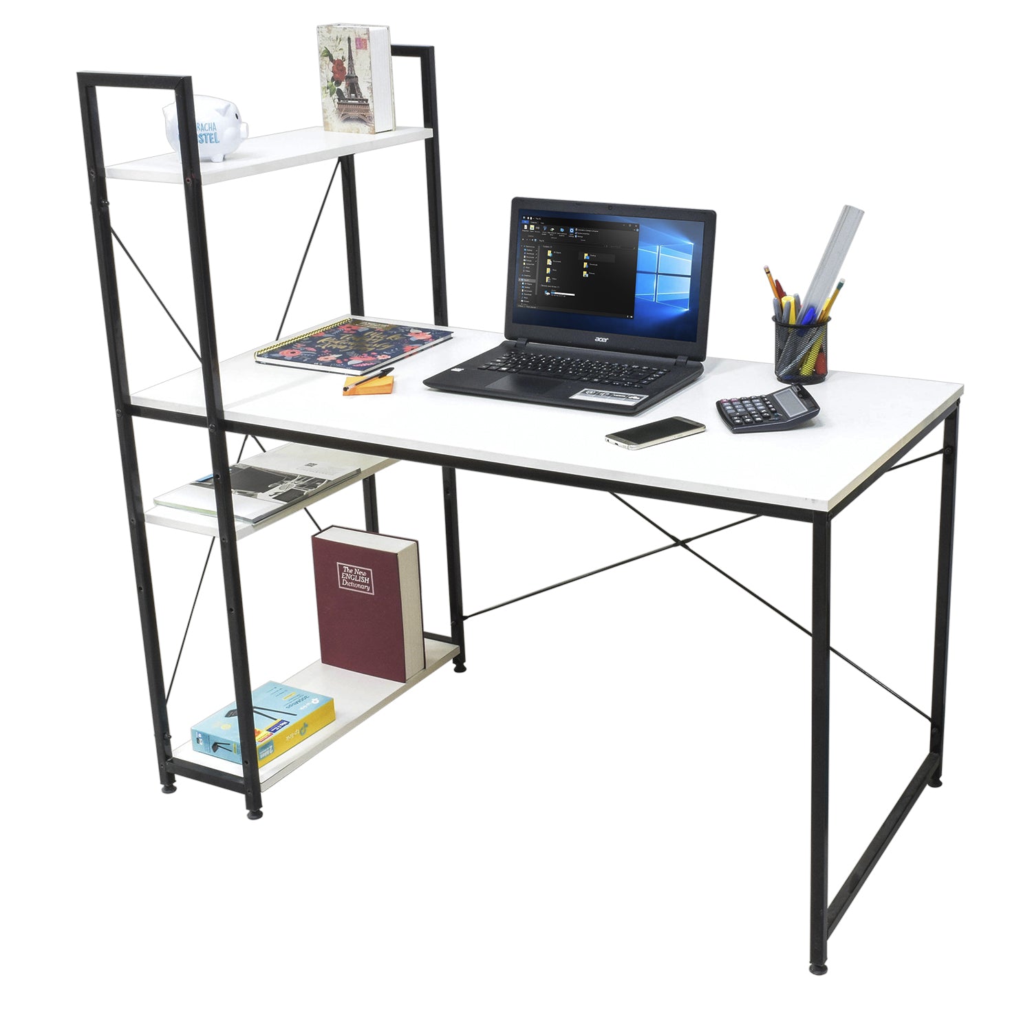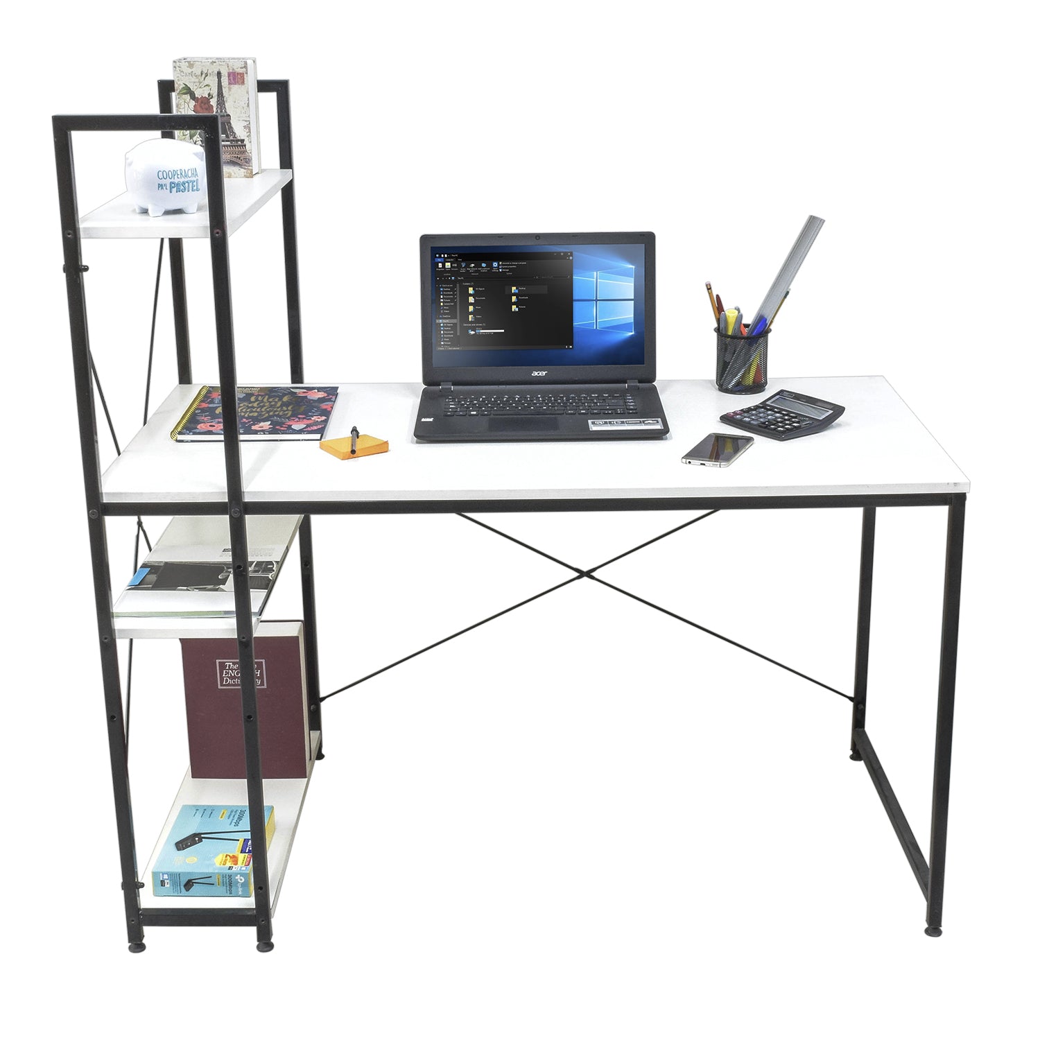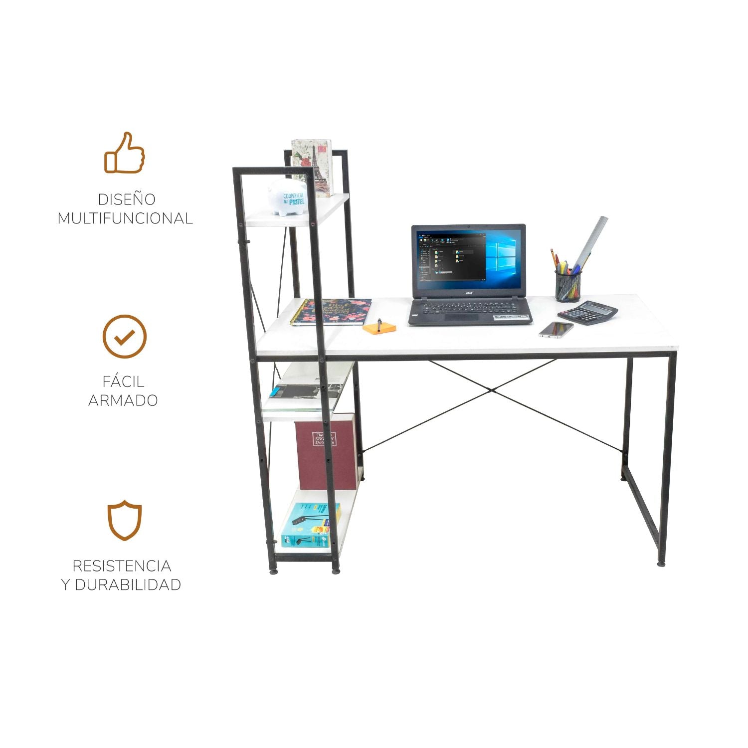 - Dimensiones: 120 cm largo x 75 cm alto escritorio / 122 cm alto con estantes x 60 cm ancho
