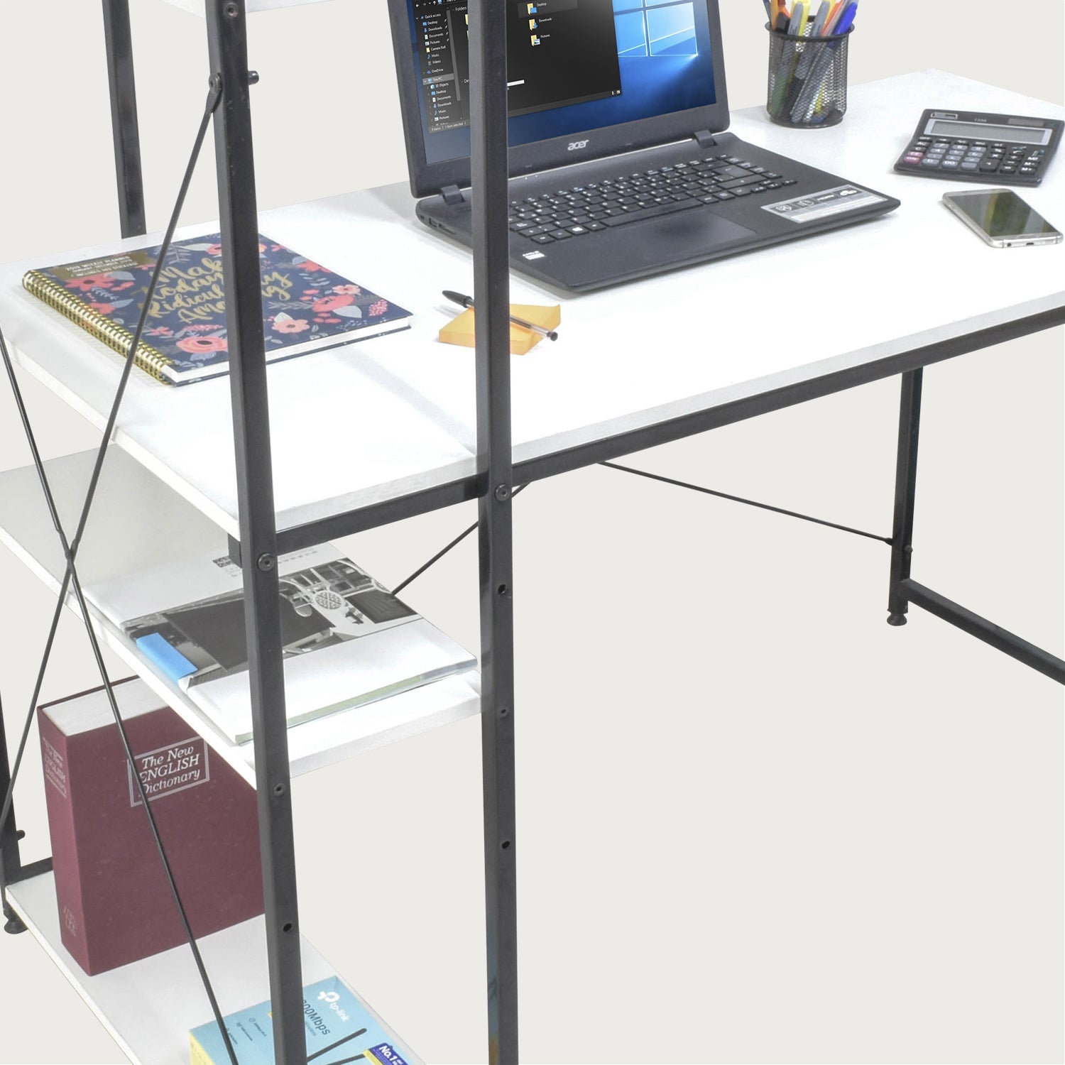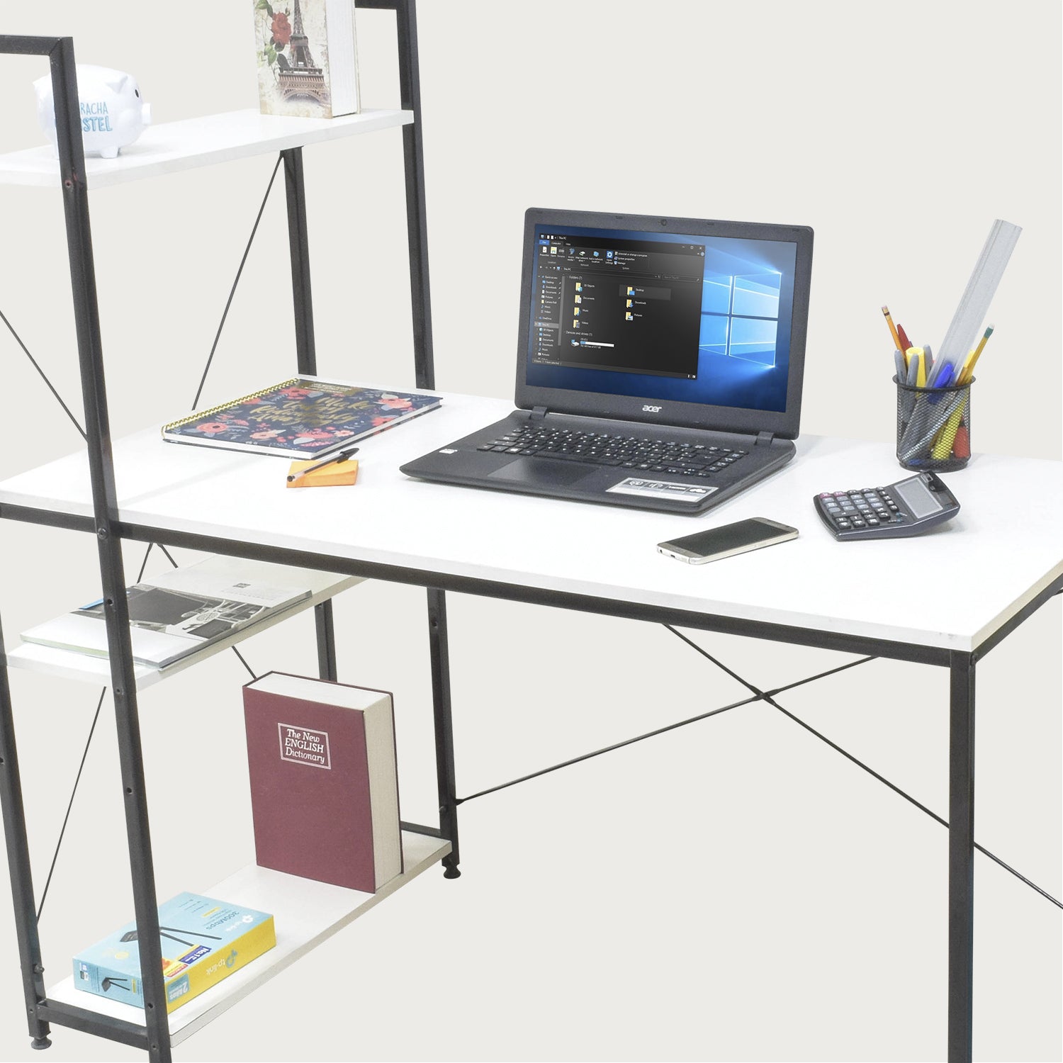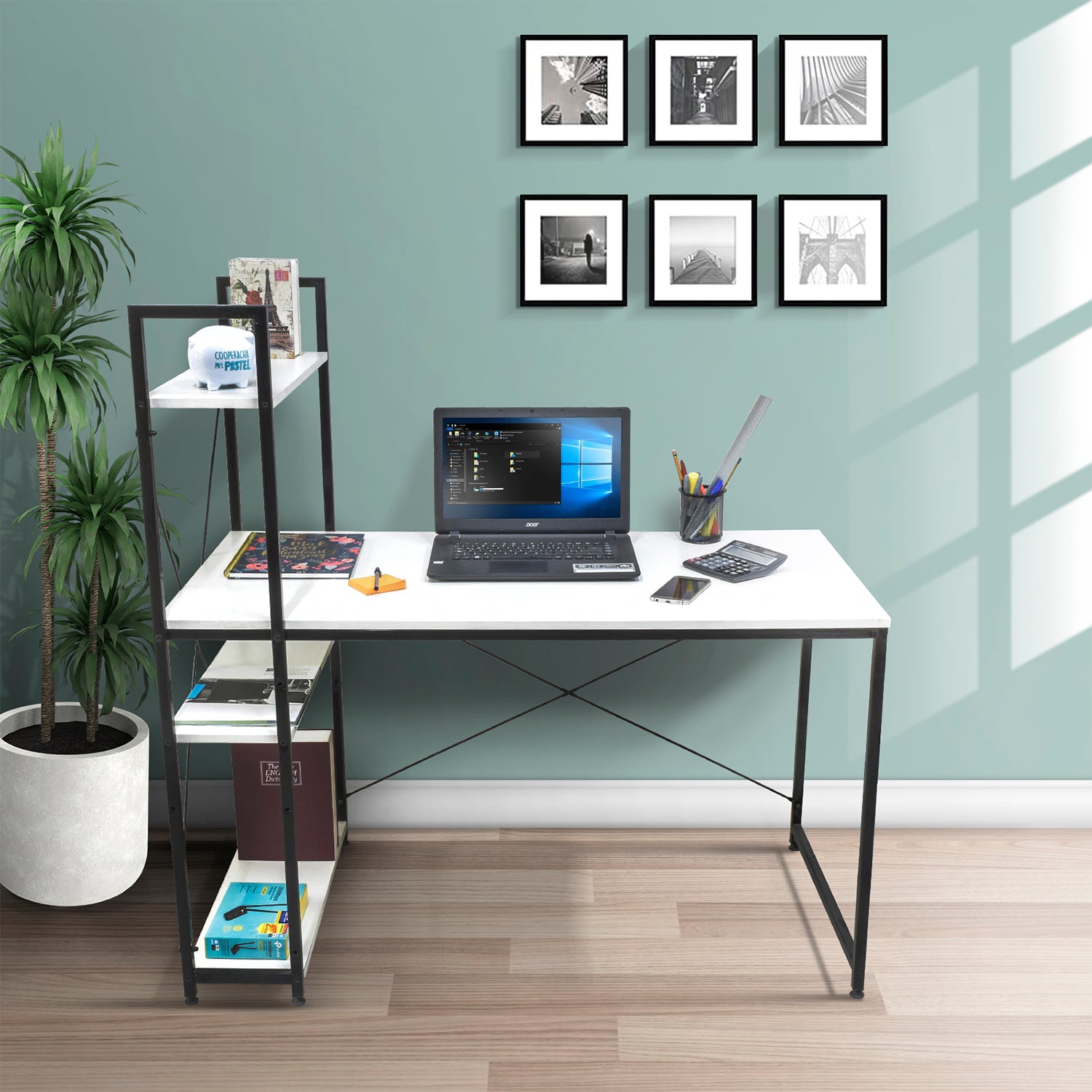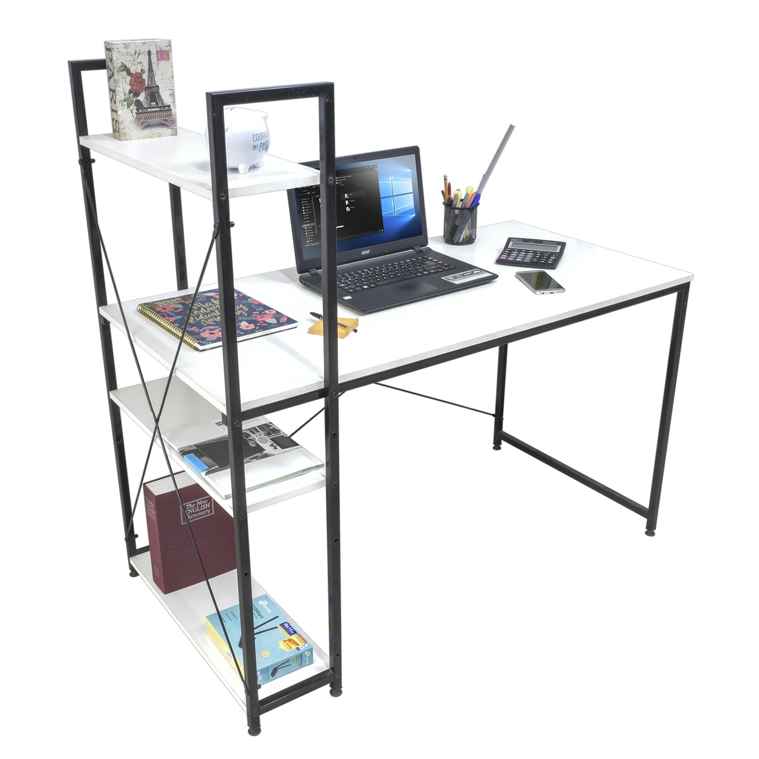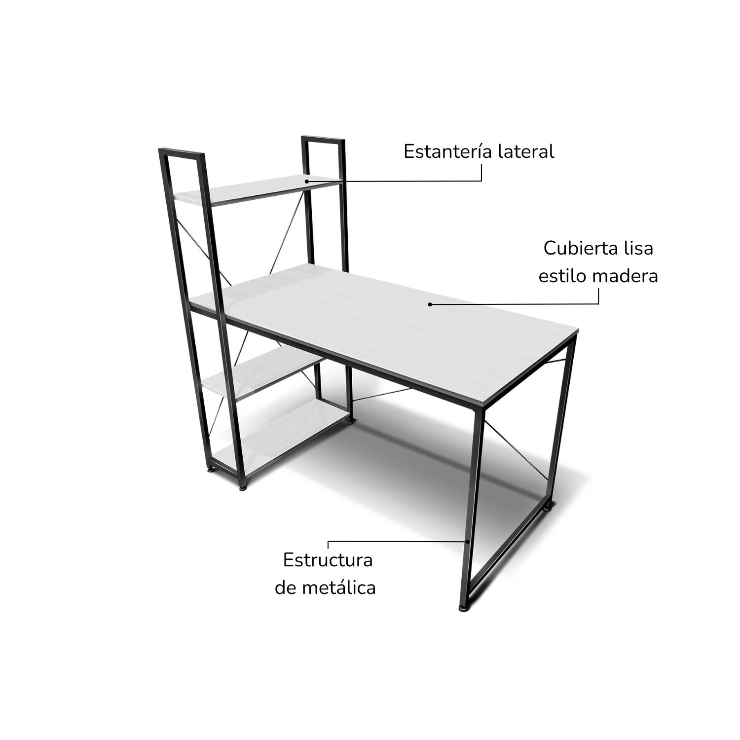 Disfruta de este práctico escritorio minimalista estilo industrial, ideal para armar tu espacio de home office o lugar de estudio en tu hogar. Gracias a su diseño con estantes, podrás aprovechar al máximo sus espacios de almacenamiento.