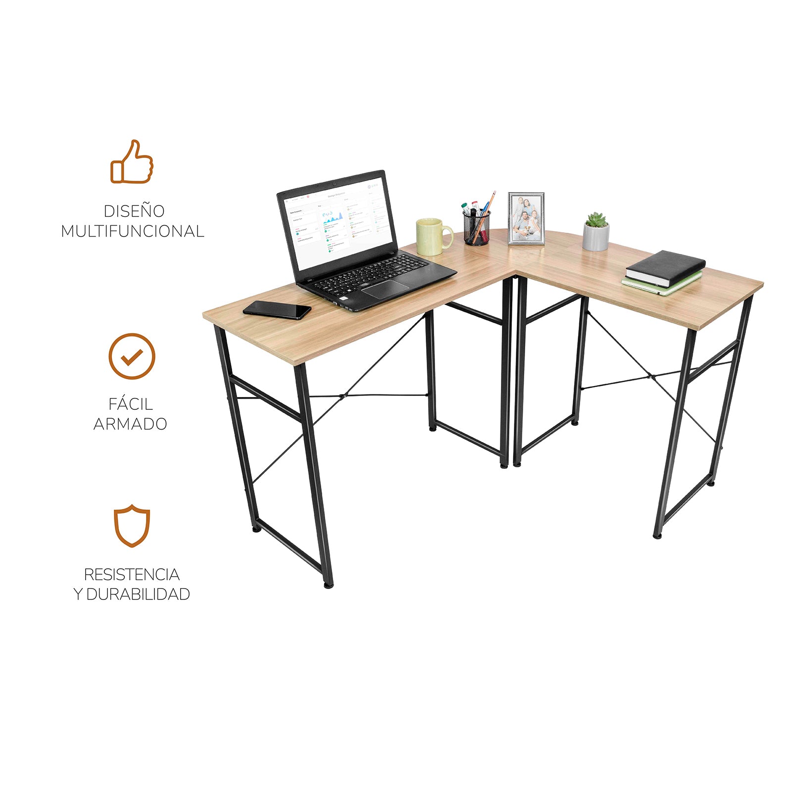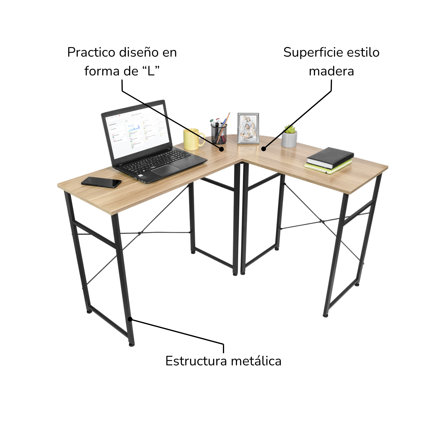 - Su diseño moderno en forma de "L" te permitirá disfrutar de una amplia superficie para colocar todos tus elementos de estudio, trabajo o juego.