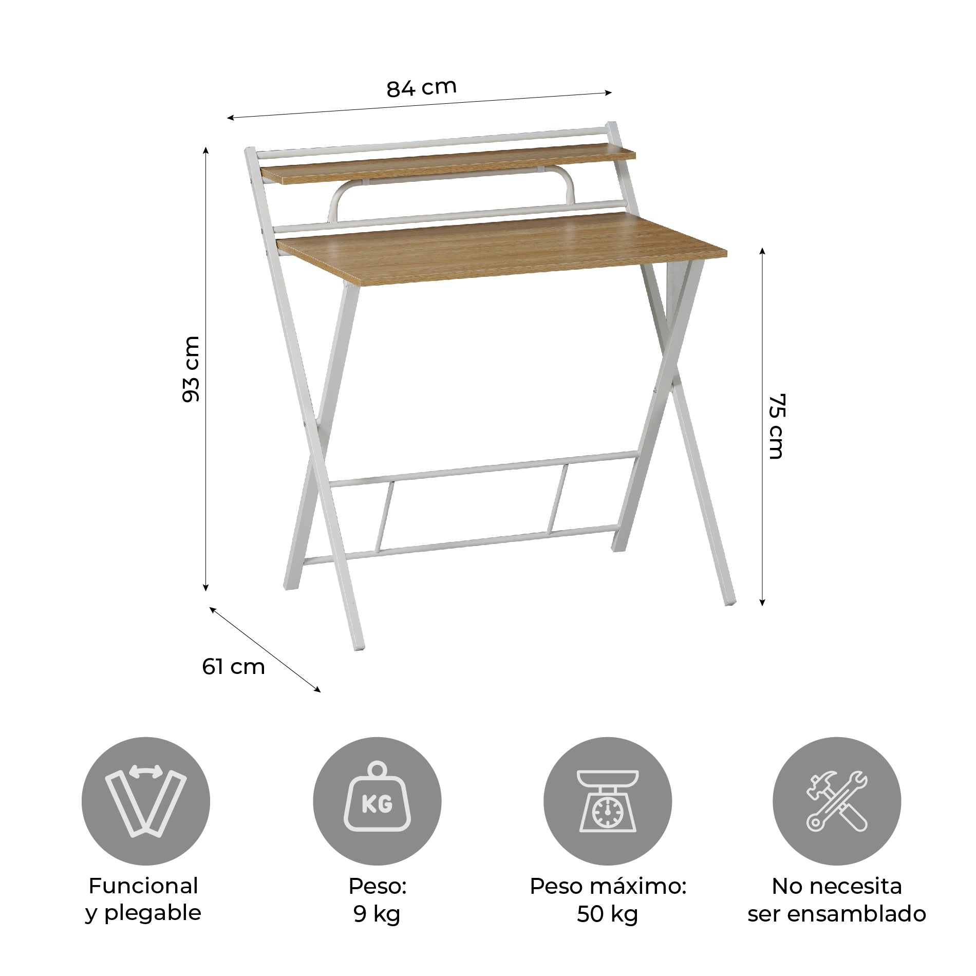 - Medidas del escritorio: 80 cm largo x 61 cm ancho x 75 - 93 cm alto (con repisa incluida)