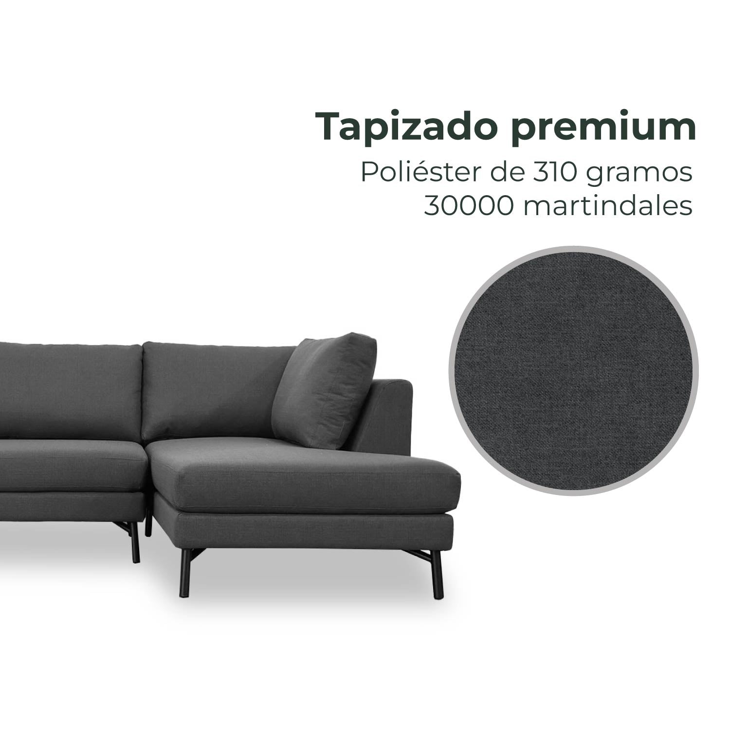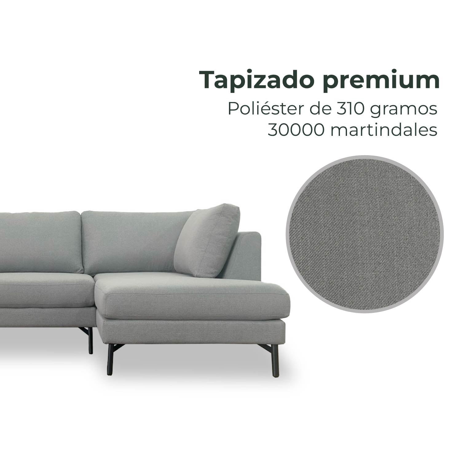 - Tapizado en 100% poliéster premium de 310 gramos (30000 martindales)