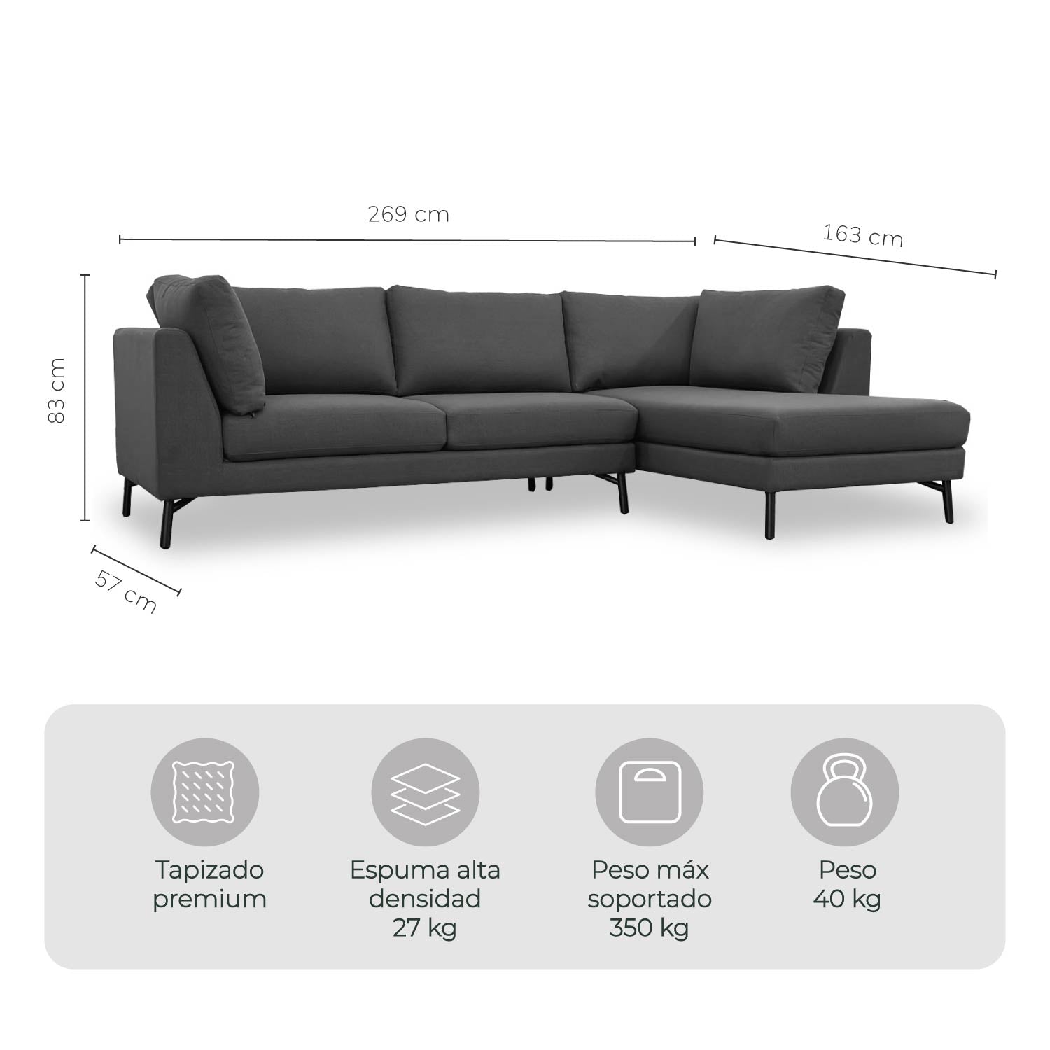 - Medidas: 269 cm largo x 83 cm alto x 57/163 cm profundidad