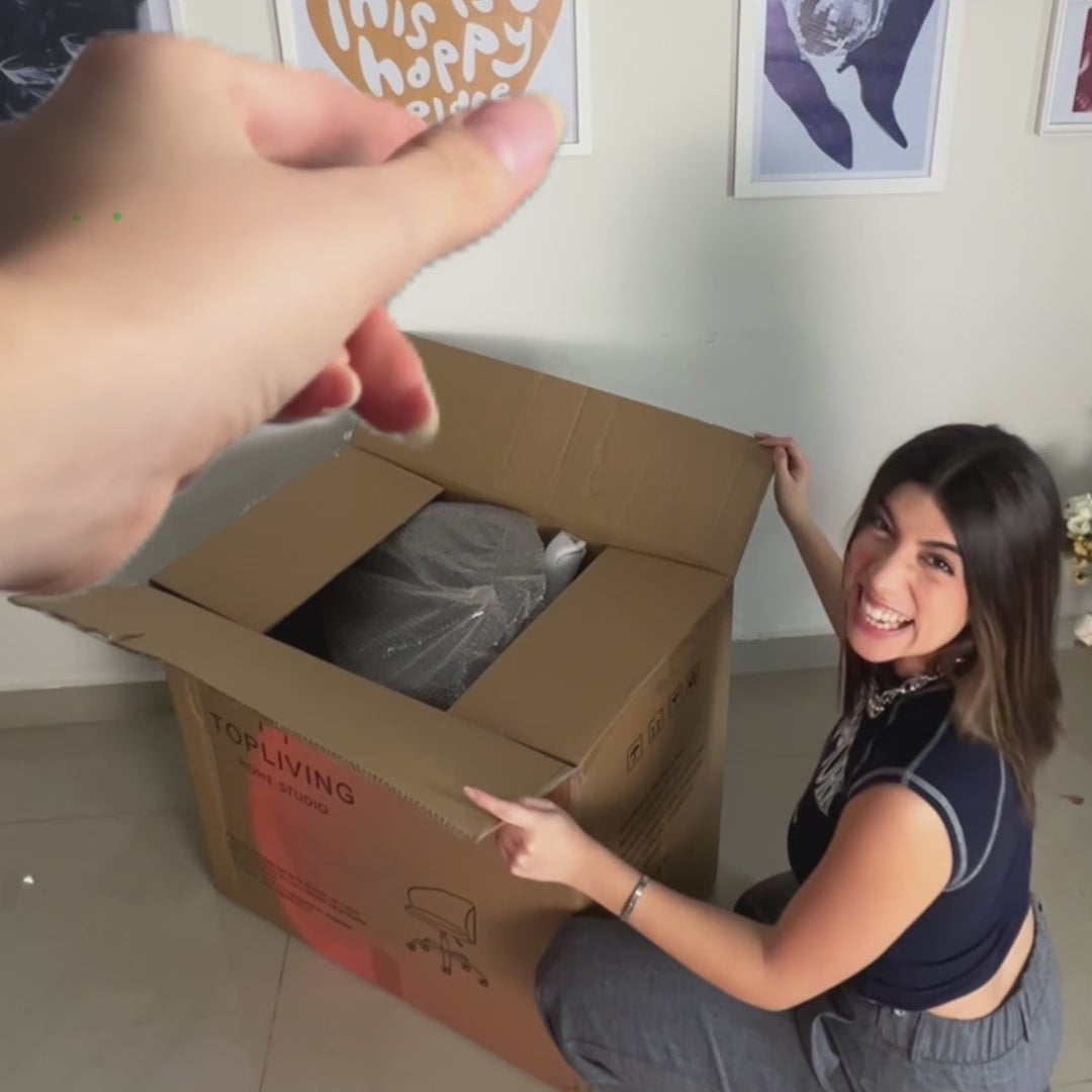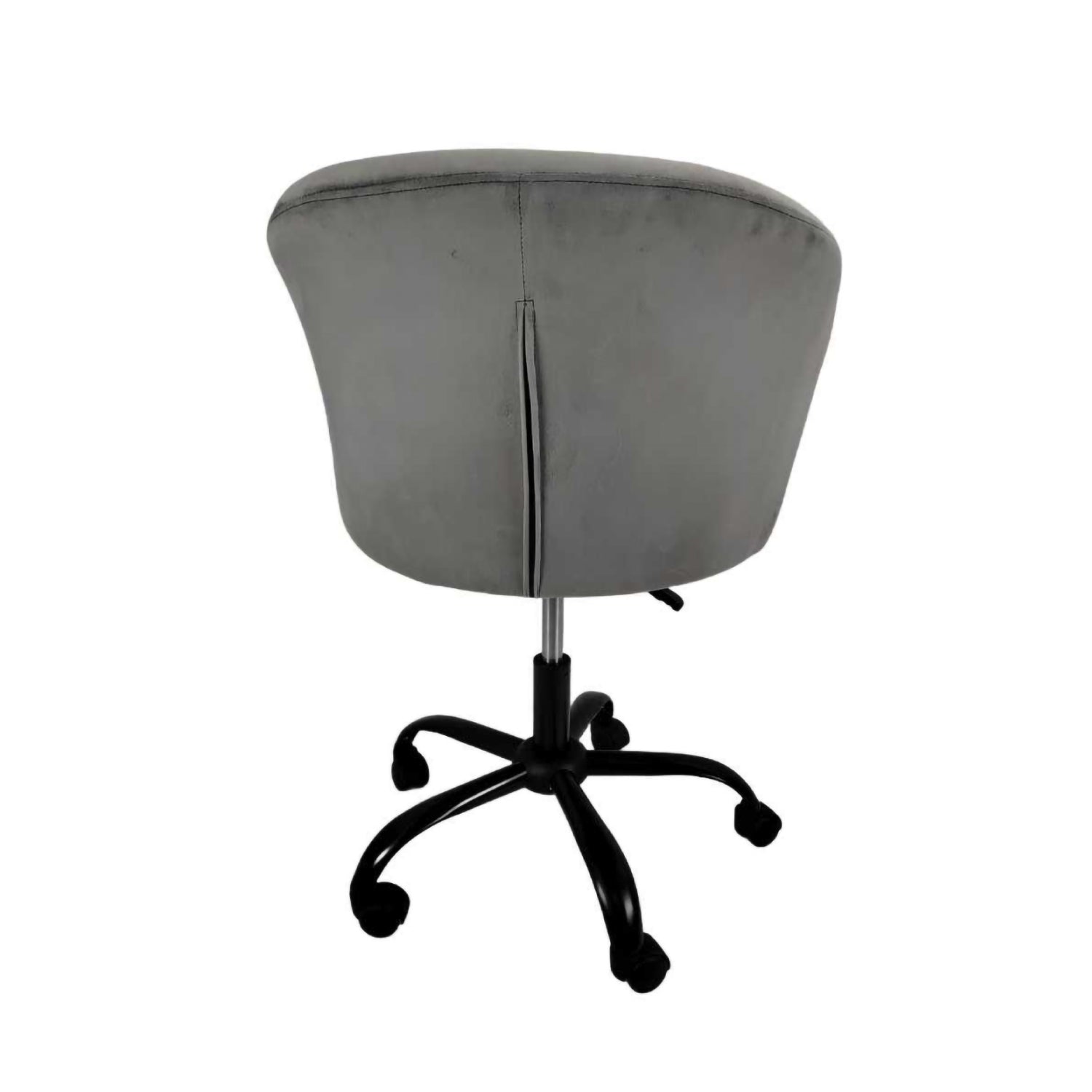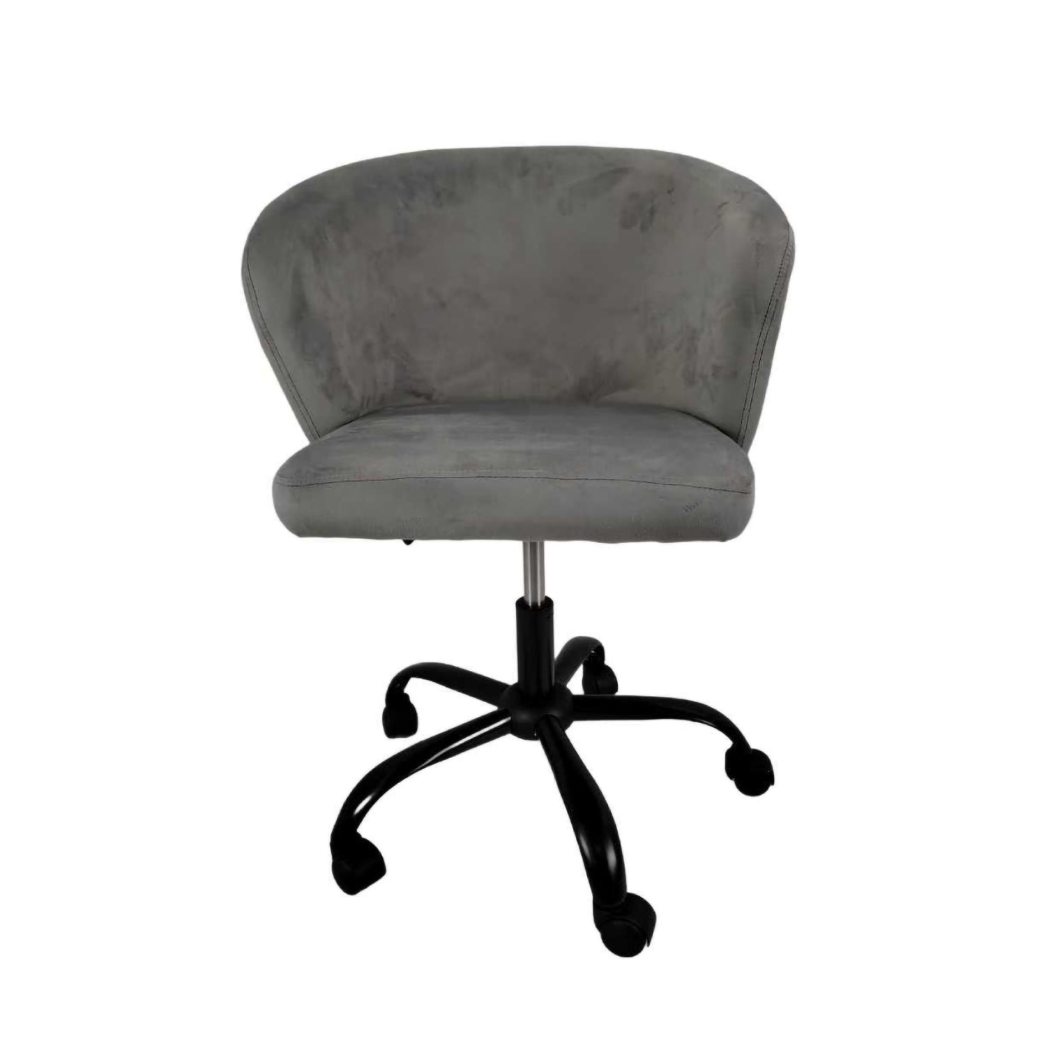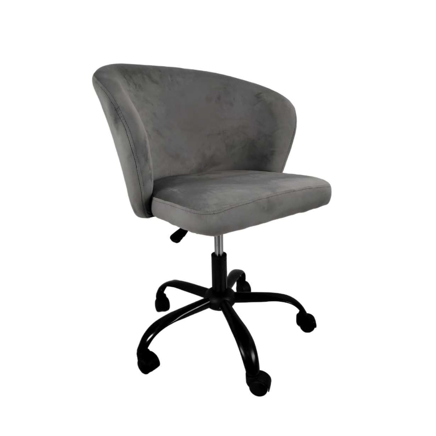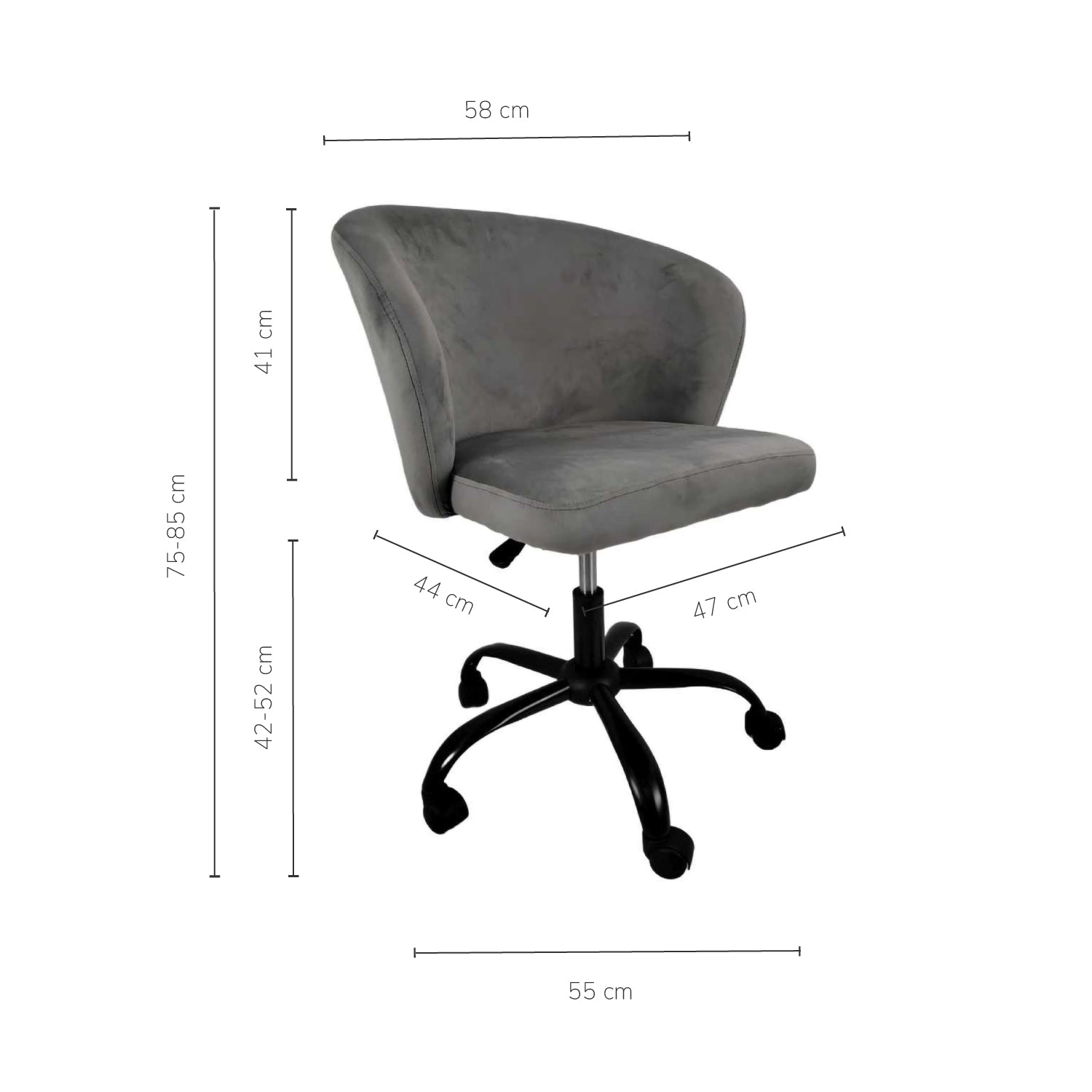 Disfruta de esta elegante silla de oficina tapizada en terciopelo gris oscuro. Su estilo moderno con terminaciones curvas combina diseño y comodidad, dándole un toque de personalidad a tu oficina, despacho o tocador.