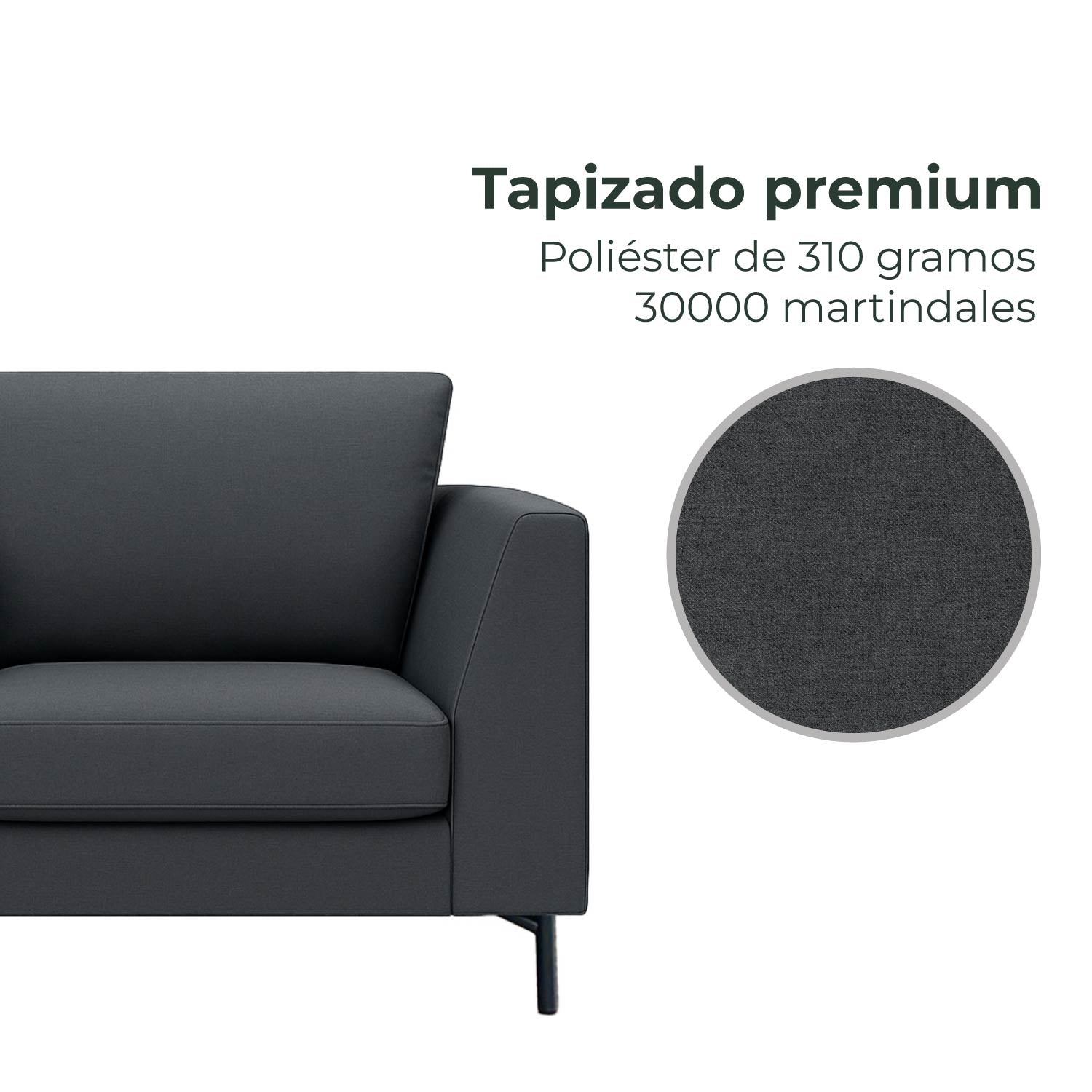 - Tapizado en 100% poliéster premium de 310 gramos (30000 martindales)