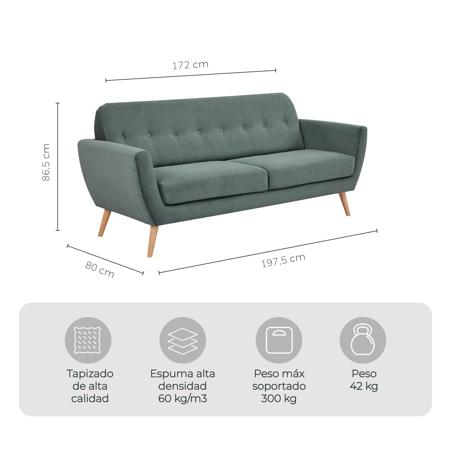 - Medidas del sillon: 197,5 cm largo x 80 cm profundidad x 86,5 cm alto