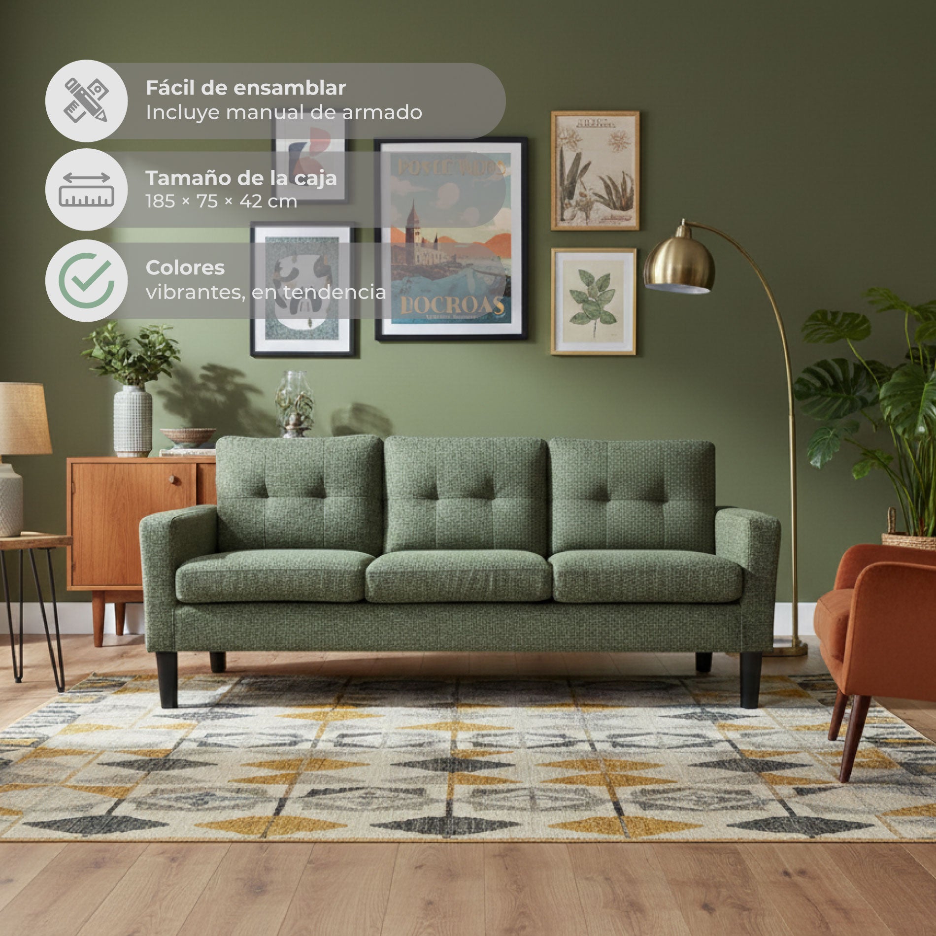 Transforma tu sala con el sofá Sutri, un sofá de 3 plazas ideal para quienes buscan estilo, comodidad y versatilidad en un solo mueble. Su tapizado verde le da un toque de color a tu espacio. Disfruta de tu nuevo centro de reuniones, comparte momentos únicos y relájate al 100% con tu nuevo sofá favorito.