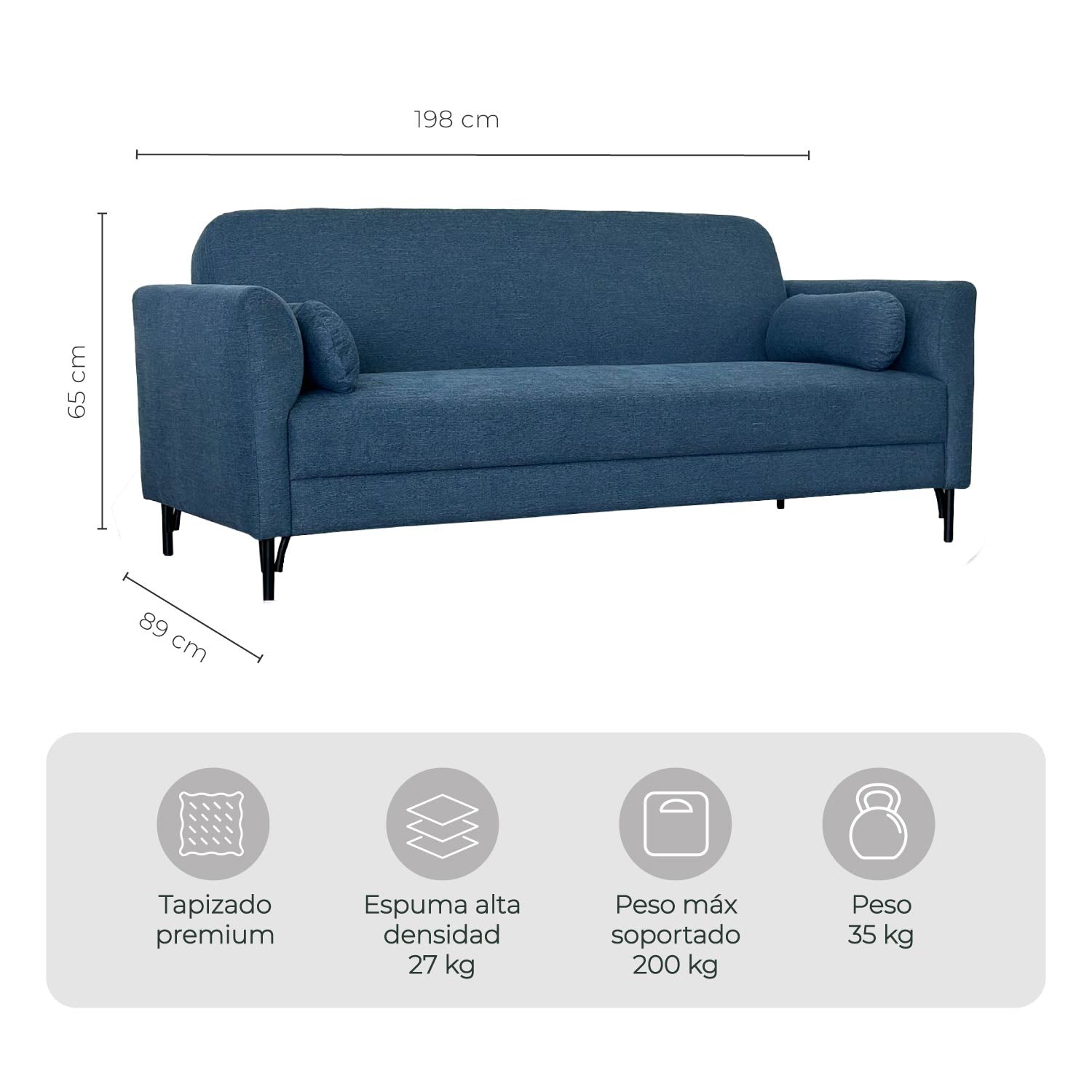 - Medidas del sofá: 198 cm largo x 65 cm alto x 89 cm profundidad