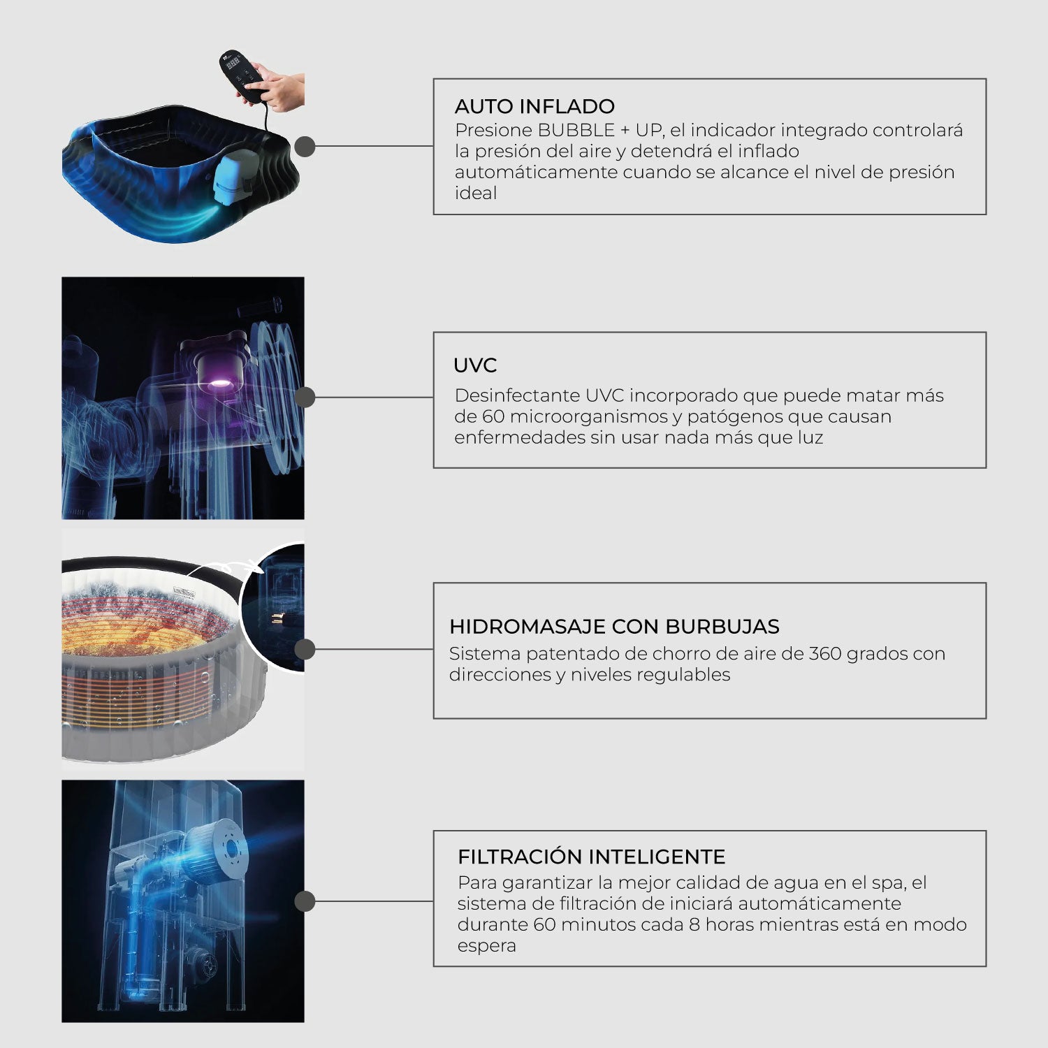 Cuentan con motor integrado en la estructura y sistema de inflado automático M-ONE™: solo debes apretar dos botones y listo. El auto-inflado monitorea la presión de forma inteligente para saber cuándo detener el inflado. Con el spa Bergen disfrutar de un momento de relajación en casa nunca fue tan fácil.